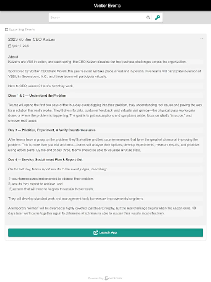 The Vontier Events app, powered by EventMobi, is your home for all Vontier corporate and operating company events. The app helps keep our events paperless, and serves up real time agendas, speaker bios, networking opportunities, and other important logistical information.