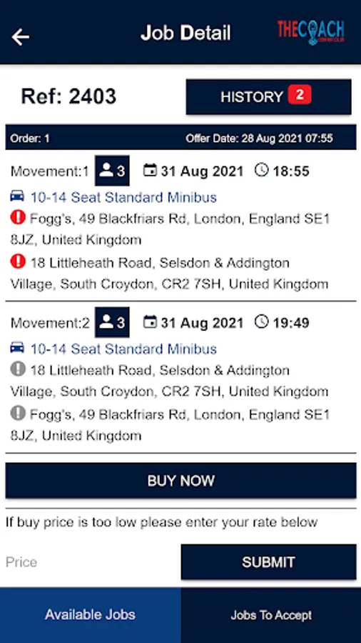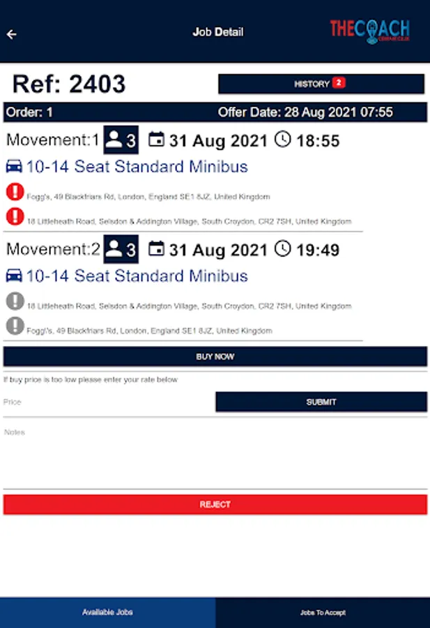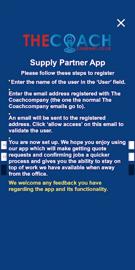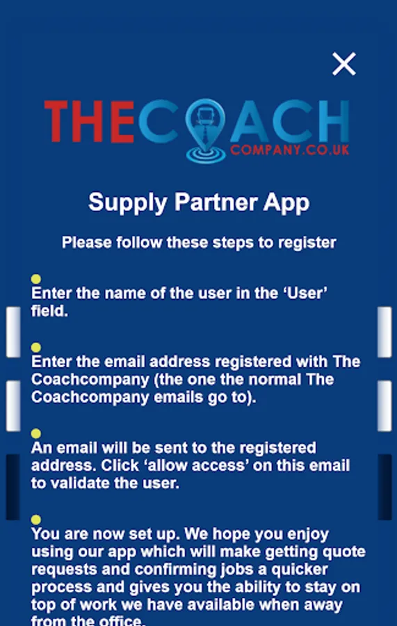 TheCoachCompany supply partner app is only for use by authorised Supply Partners of TheCoachCompany. The app will enable Supply Partners to be notified of new jobs in their area, bid or buy those jobs and confirm acceptance of allocated jobs. Only authorised Supply Partners fill be able to register.
