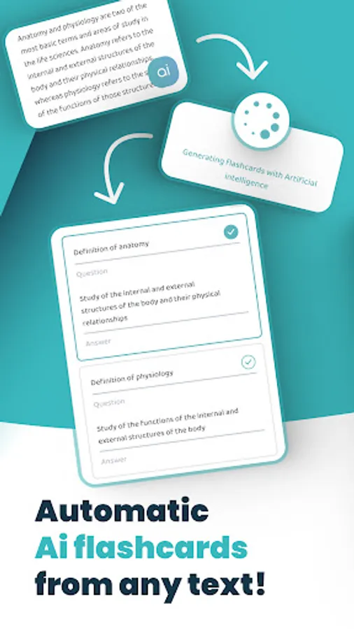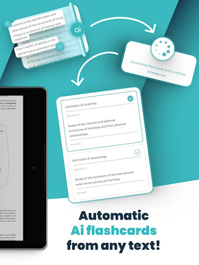 Instead of typing in the answer, simply choose the words you want to hide in the question. Very useful for definitions or memorizing paragraphs. You can create fill in the blanks easily: simply take a picture of the textbook, Voovo scans the text for you automatically and you are ready to go.