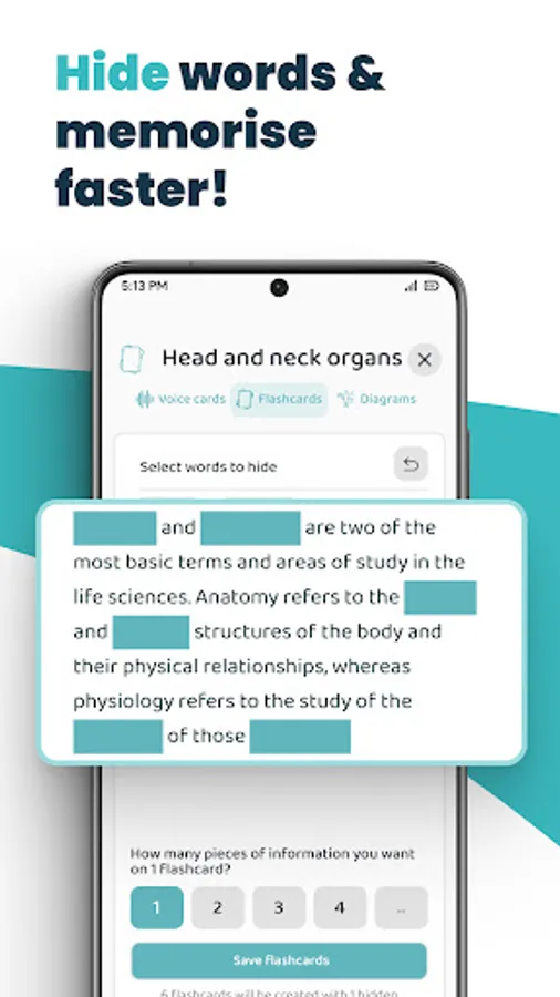 This is the fastest way to create a study card. This method allows you to make more than 300 in just 1 minute. You simply take a picture of a diagram and Voovo does all the rest: using text analyzing algorithm, we find all the text on the picture, put it into boxes and your flashcards are ready to be revised.