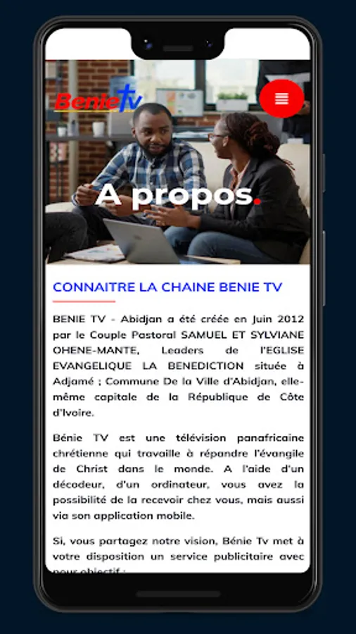 BENIE TV -Abidjan a été créée en Juin 2012 par le Couple Pastoral SAMUEL ET SYLVIANE OHENE-MANTE , Leaders de l’EGLISE EVANGELIQUE LA BENEDICTION située à Adjamé ; Commune De la Ville d’Abidjan,elle-même capitale de la République de Côte d’Ivoire.