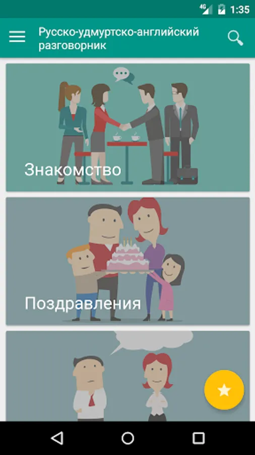 Traveling in Udmurtia, the tourists certainly faced with such a problem that they could not tell the basic phrases in the Udmurt, for example, ask "how are you?" or "what's your name?". In the end, it has to be explained by gestures. The application will also be useful for language learners, as it will contain the most frequently used phrases. User applications will be able to listen to the sound of phrases, mark them as favorites, search for common database of phrases.