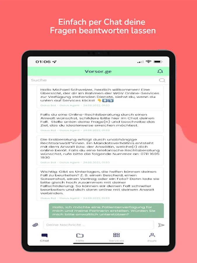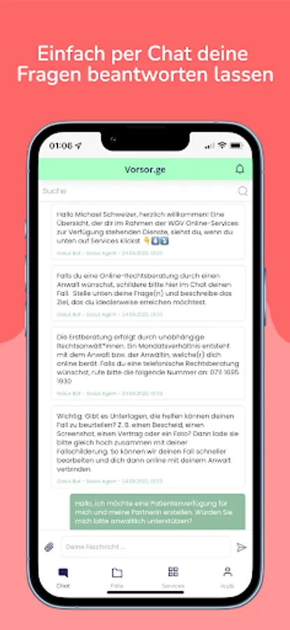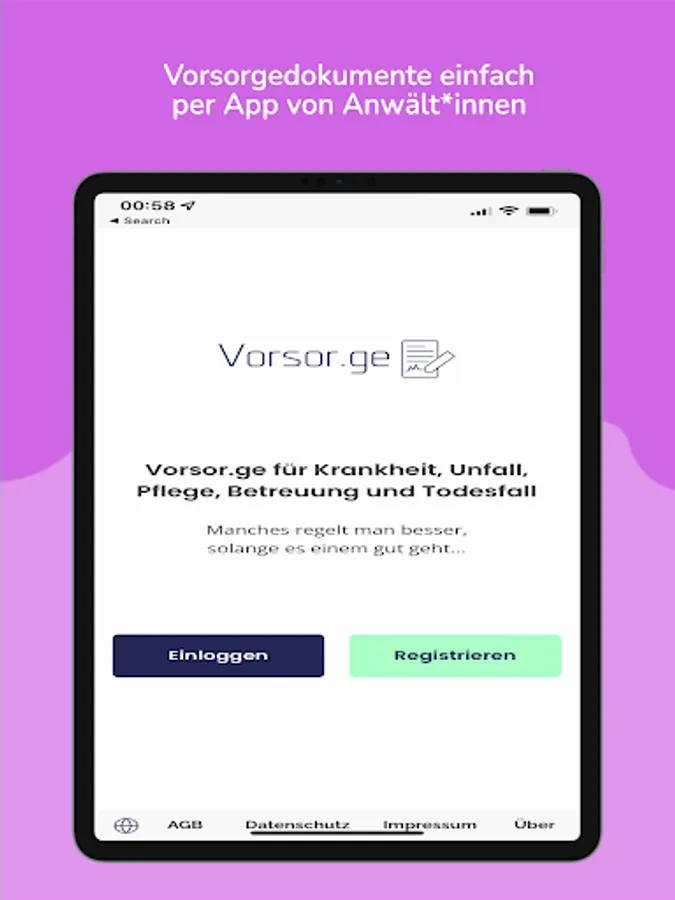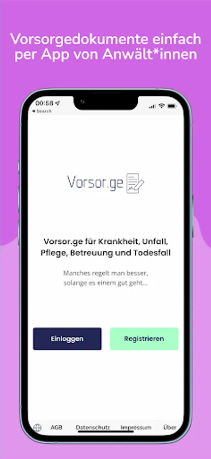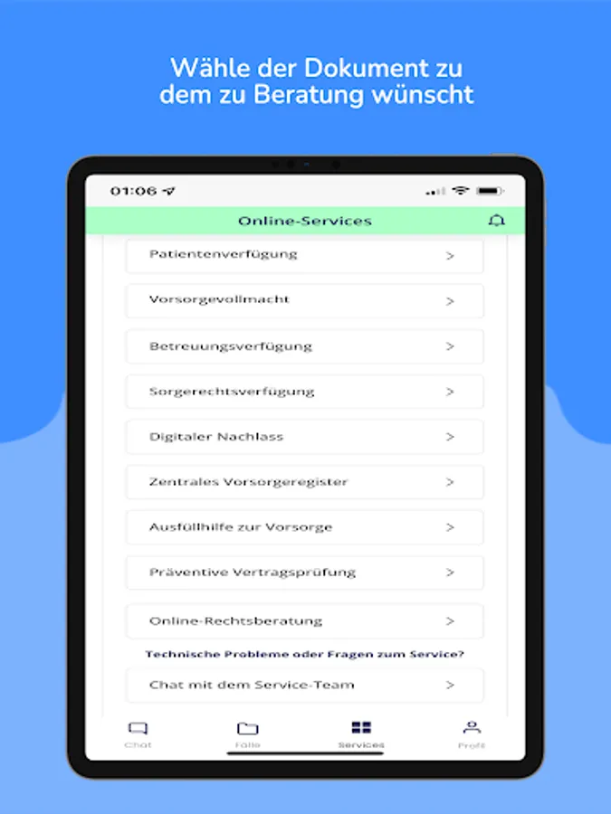 Simply create your individual pension documents via app with the help of experienced lawyers in a 1-to-1 chat - as well as via voice and video calls. Protect yourself and your loved ones today. With the support of a lawyer, you will receive all important documents in a personalized way. For example, your living will, power of attorney, power of attorney, power of attorney, regulation of digital inheritance, power of attorney for care, power of attorney for company health care, animal owner directive, funeral directive, will. You can also register in the central pension register.