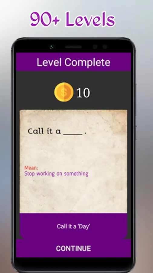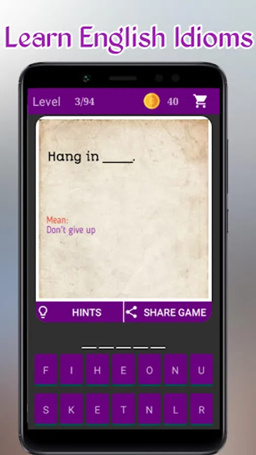 You have to answer the question by guessing the word to complete English idioms or phrase and write the correct answers and the more you guess the more coins you will earn, the coins are necessary to pay for hint of the game.