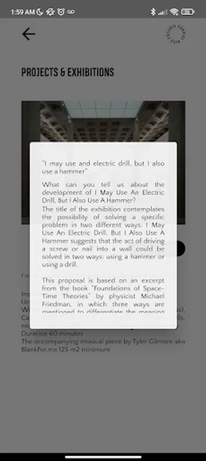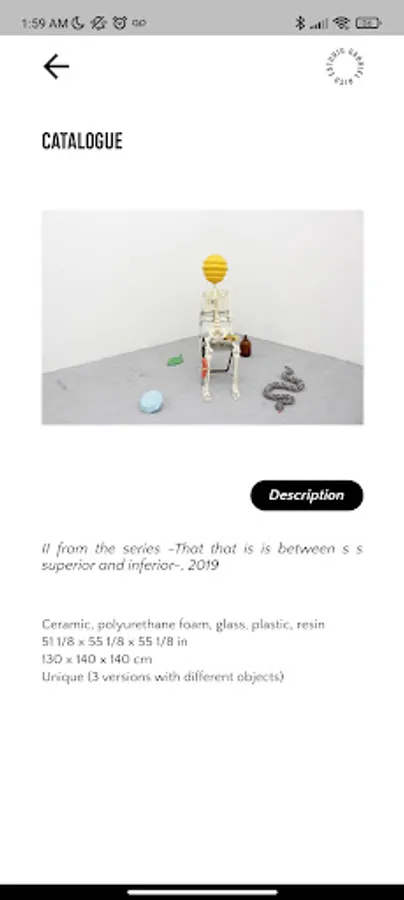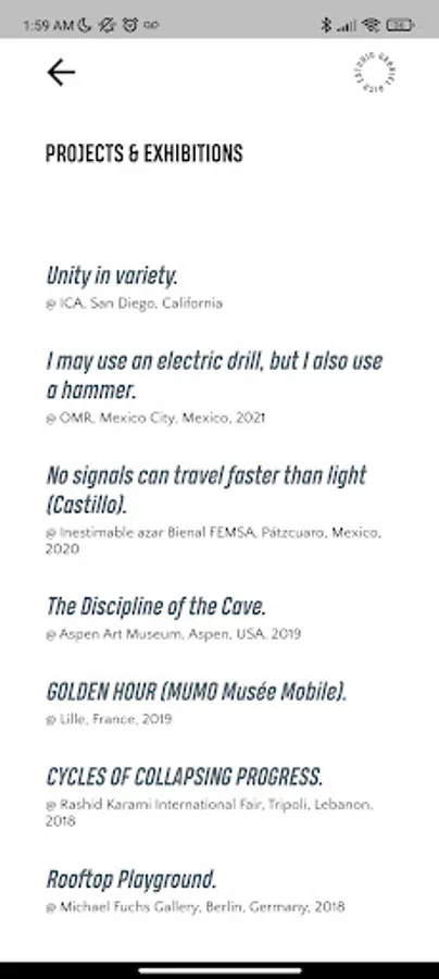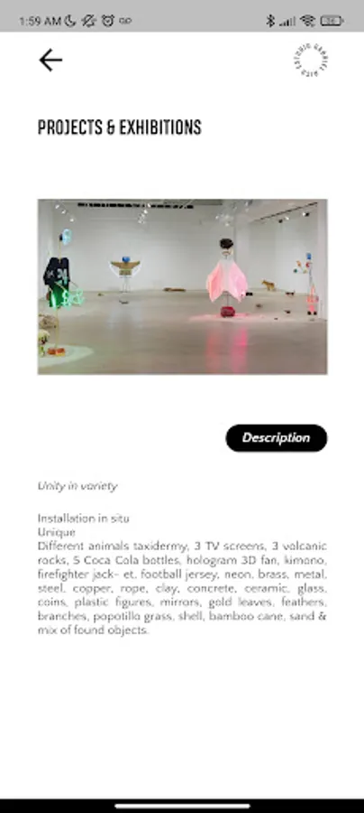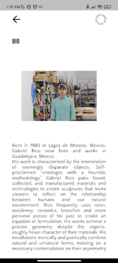 Aplicación representativa del artista internacional Gabriel Rico. Se expone piezas únicas del artista de las exhibiciones de arte y las exhibiciones hechas en diferentes partes del mundo; cada sección contiene descripción de las piezas o exhibiciones. Se añade página web del artista.