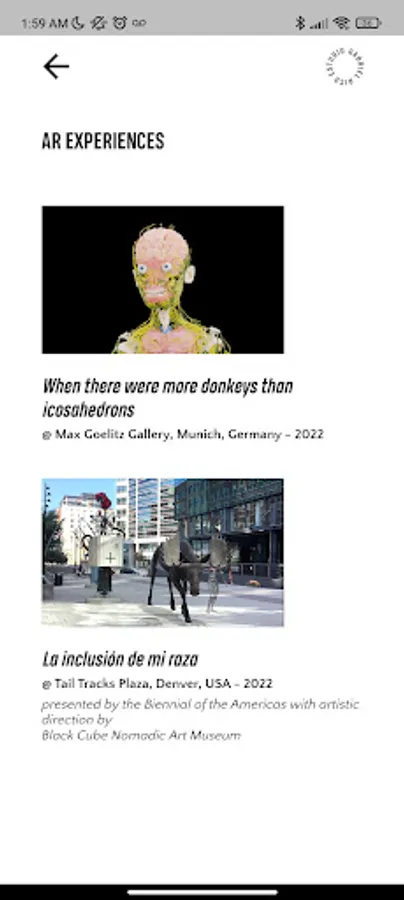 Adicionalmente la aplicación cuenta con dos experiencias de Realidad Aumentada que forman parte, de manera complementaria, de las exhibiciones del artista.