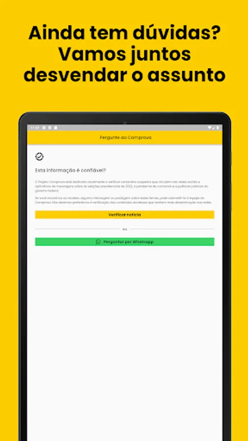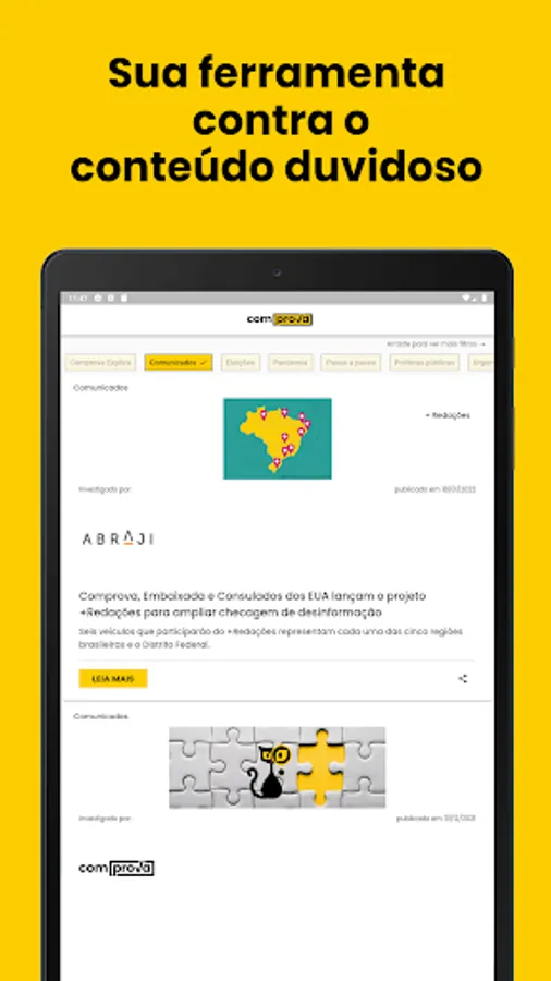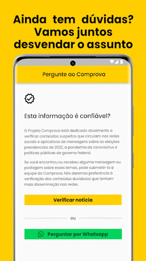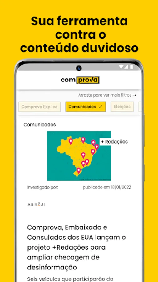Projeto Comprova is a collaborative, non-profit initiative that brings together journalists from 43 Brazilian media outlets to discover and investigate suspicious information about public policies, presidential elections and the covid-19 pandemic that has been shared on social media or messaging apps. .