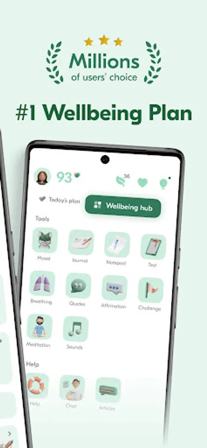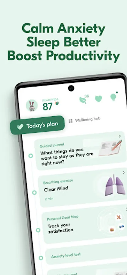 🌱 Now your self-care process can begin! Every day, VOS will invite you to a personalized set of activities. You'll get a mixture of self-help tips, breathing/meditation exercises, AI journaling, notepad writing, inspiring quotes, affirmations, mood tracker, tests, blog articles, challenges, or sounds.. They are all based on your self-therapy plan to help you tackle anxiety and uncomfortable emotions.