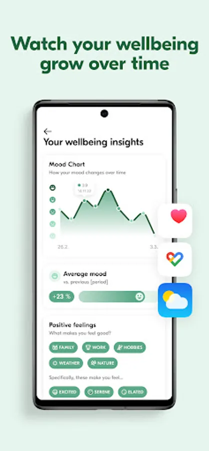 📊 Small steps every day become huge leaps over time. VOS lets you finetune your path toward mental balance with personalized insights. In your personal Mood Chart, you'll see how your mood is evolving over time and see what makes you feel down and what picks you up. Plus if you connect the app with Google Fit, you'll be able to track how your physical activity impacts your mental health, stress, or sleep.