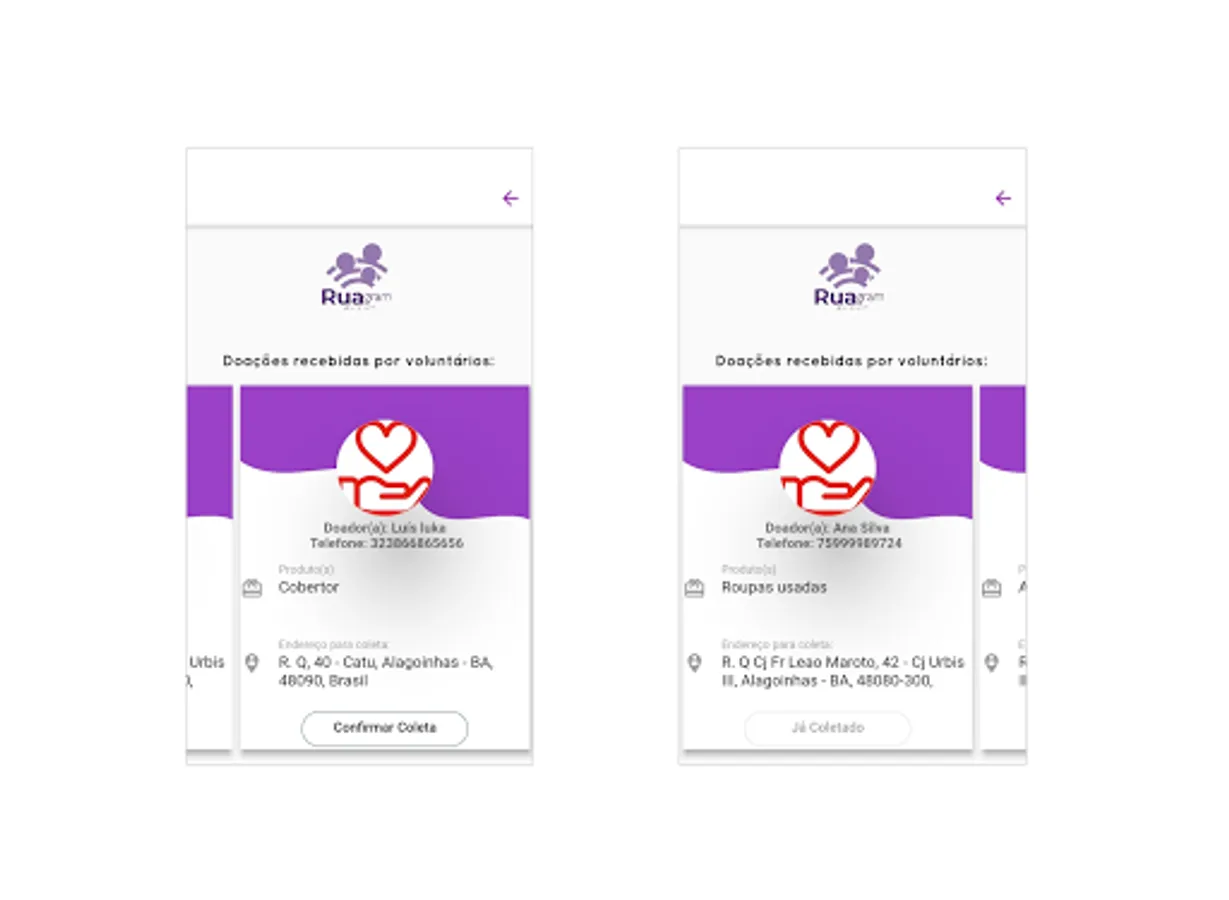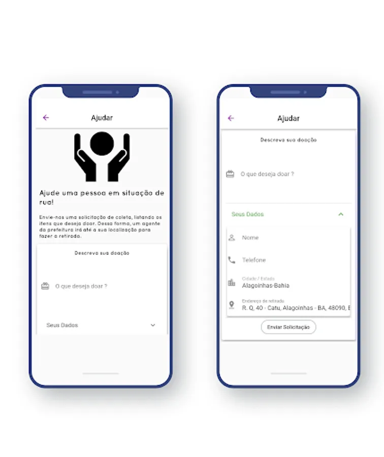 In addition, RuaGram has a second environment that does not require access credentials. It is geared towards society as a whole, and will serve as a link to volunteering. In this environment the citizen who wishes to donate some type of product to be delivered to people on the street, can use their Geolocation and fill out a simple form. With that, a collection request will be registered in the system and a social worker will go to the residence to collect the donated material.