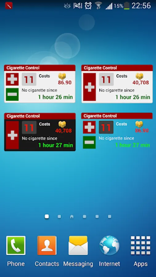 - widget - total number of cigarettes, adding another cigarette, tracks the costs and the elapsed time since the last cigarette