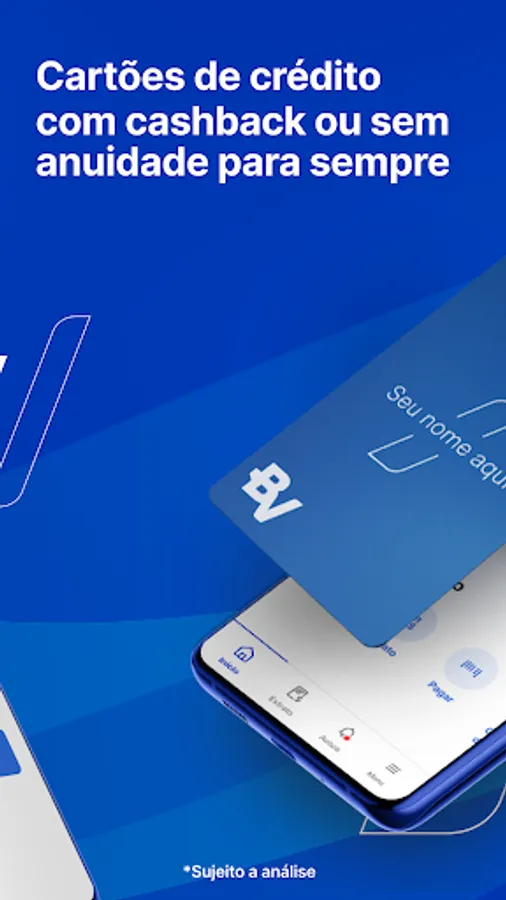 Have a credit card and choose between the Free BV Card with no annual fee forever, the BV Mais Card with cashback of up to 1% on all purchases, free vehicle and home assistance and the BV Único Card with cashback of up to 1.5% on all purchases, two free accesses per year to airport VIP lounges and other benefits*