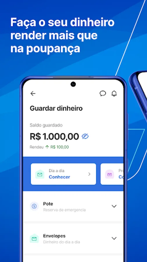 Facilities such as free and unlimited withdrawals at any time on the Banco24Horas network, Pix, bill payment, balance and statement consultation, option to save money according to your goals, yielding more than in savings and more*