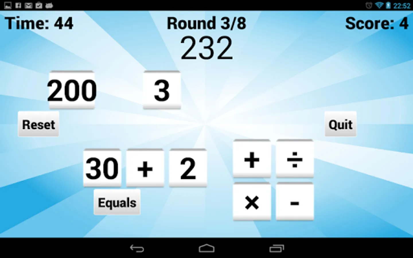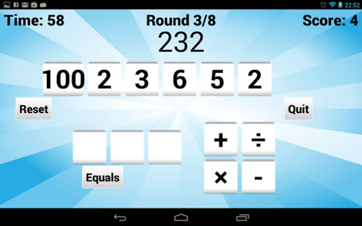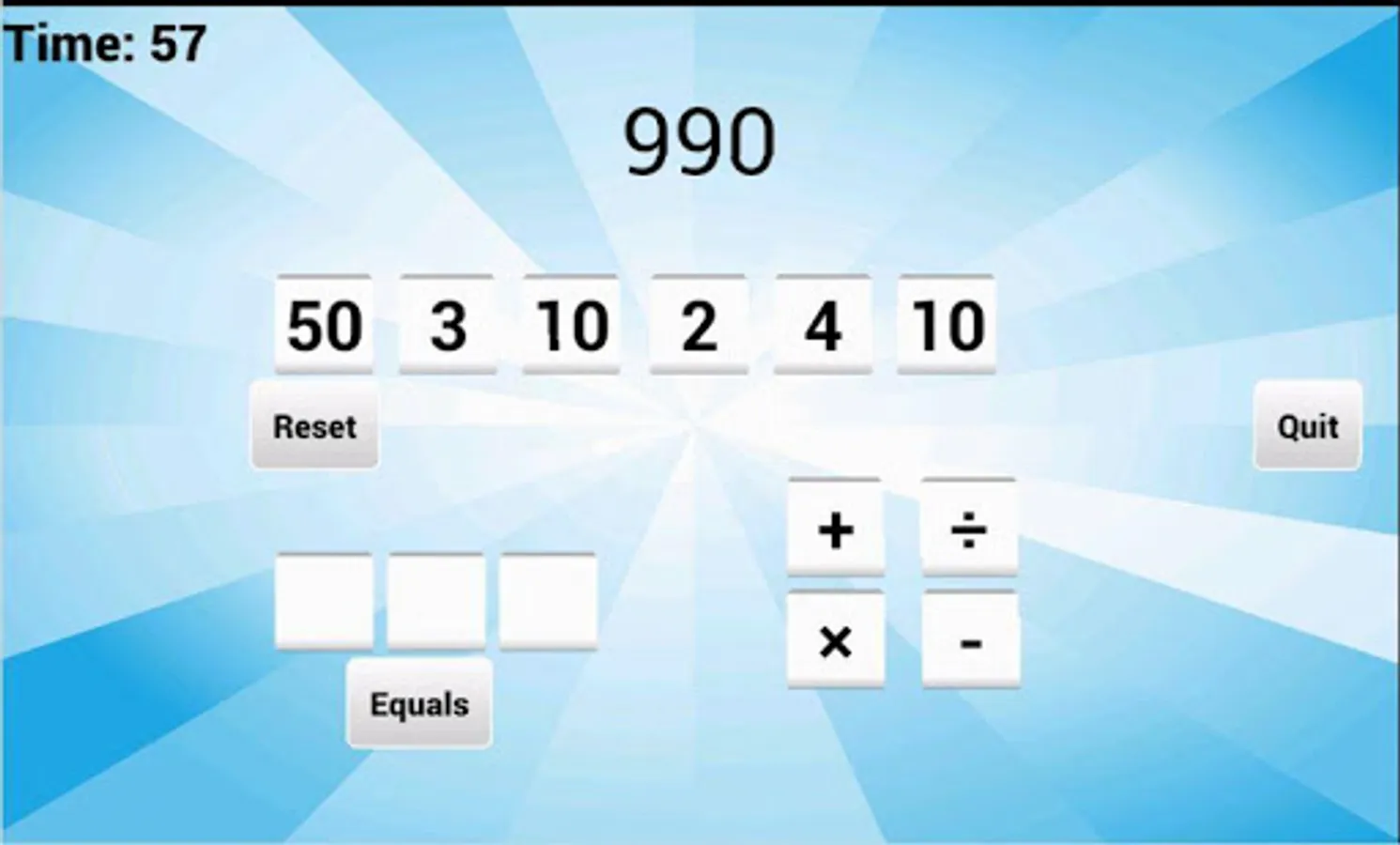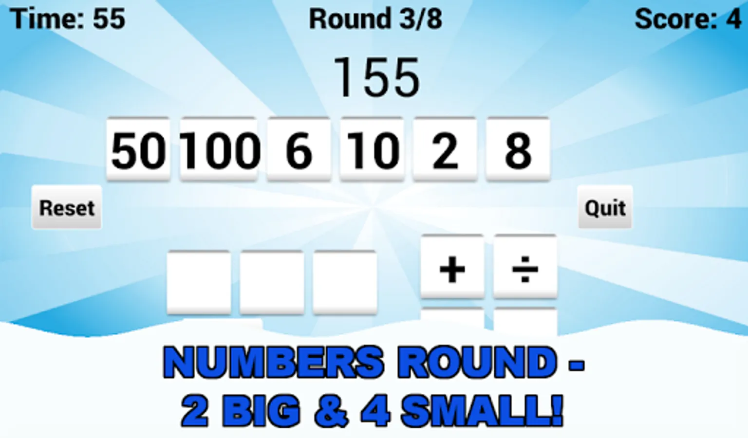 Based on the popular Countdown tv game show! Select vowels and consonants to test your English language skills against the clock! Select big numbers and small numbers then see the target and solve the maths puzzle before the clock counts down! Sign-in and post your scores on the Global Leaderboard and compare your high scores against players all around the world!