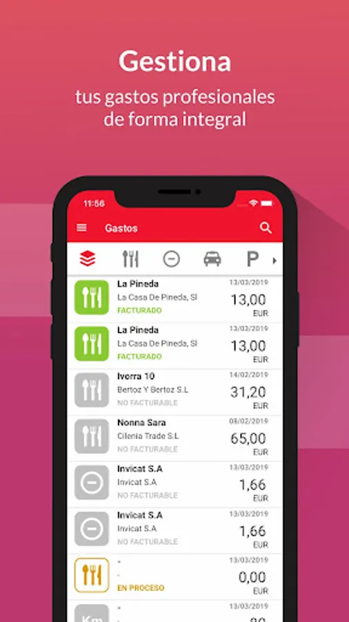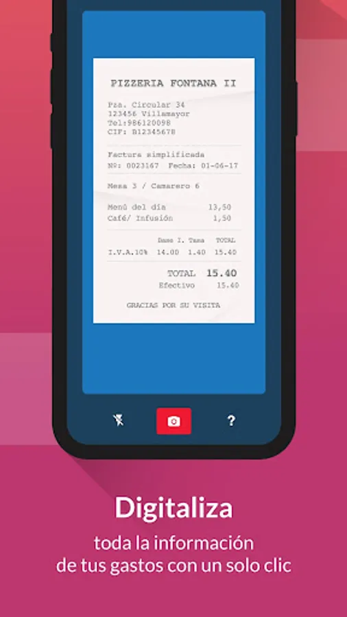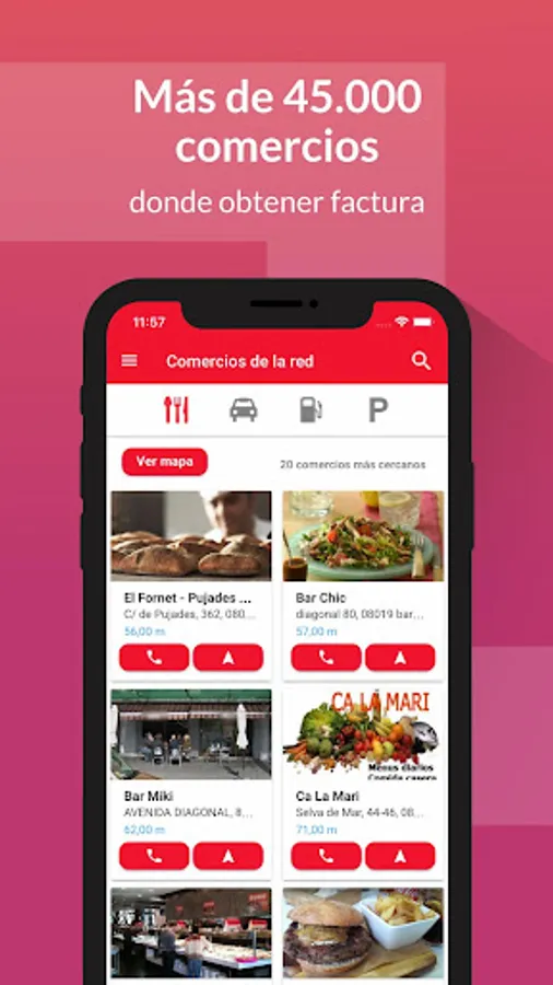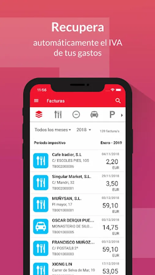 DevoluIVA is the only service with which you can recover 100% of VAT by automatically generating electronic invoices for your professional expenses. With this app, you can locate the more than 400,000 cafeterias, restaurants, gas stations, car parks, stationery stores, supermarkets, tolls and taxis in the DevoluIVA network where you will automatically obtain electronic invoices for your expenses. If you cannot find your usual establishments, we will affiliate you with the DevoluIVA network.