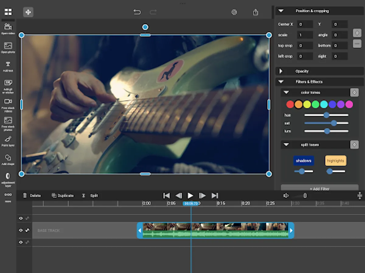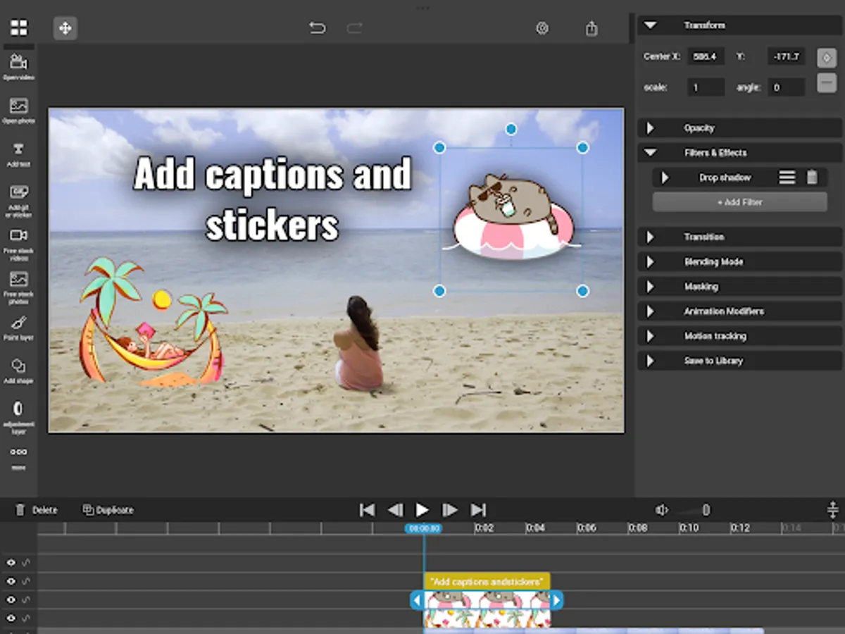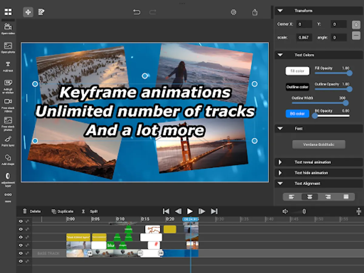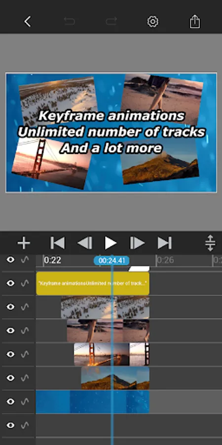 - keyframe-based animation lets you animate practically anything: layer position, opacity, filter parameters, audio volume, etc.