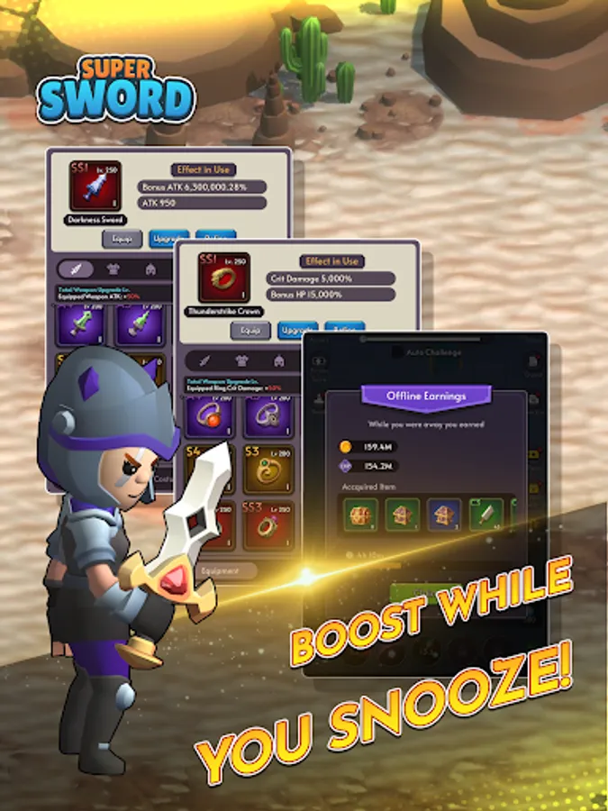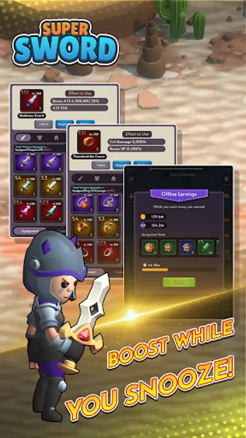 "Super Sword - Idle RPG" is an epic adventure that combines the thrill of swordplay with the ease of idle gameplay. Immerse yourself in a captivating fantasy world teeming with powerful enemies, ancient treasures, and legendary heroes. As the chosen one, it is your destiny to wield the fabled Super Sword, an artifact of immense power.