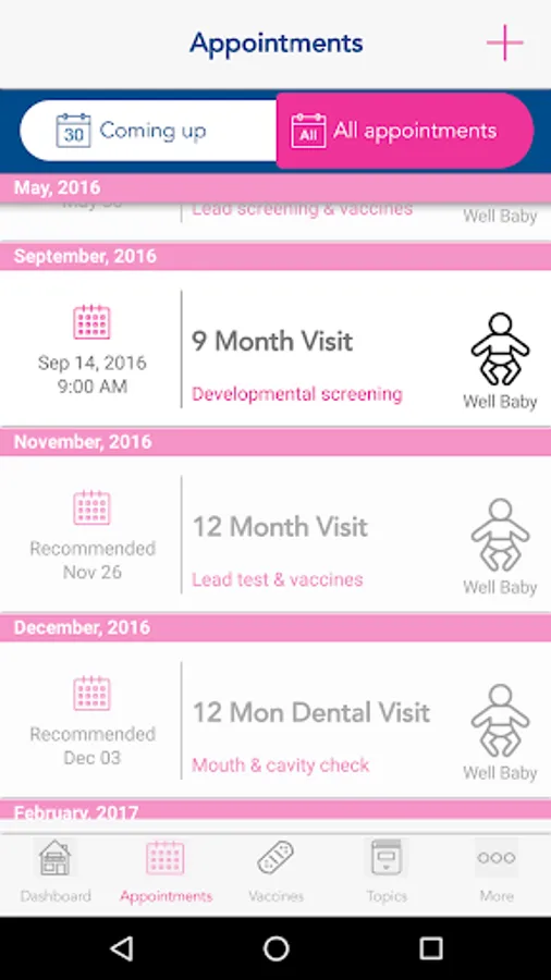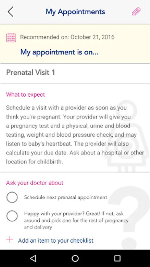 • Personalized calendar to keep track of your prenatal and well-baby visits