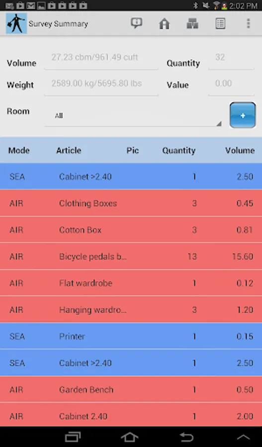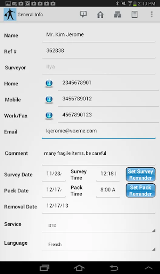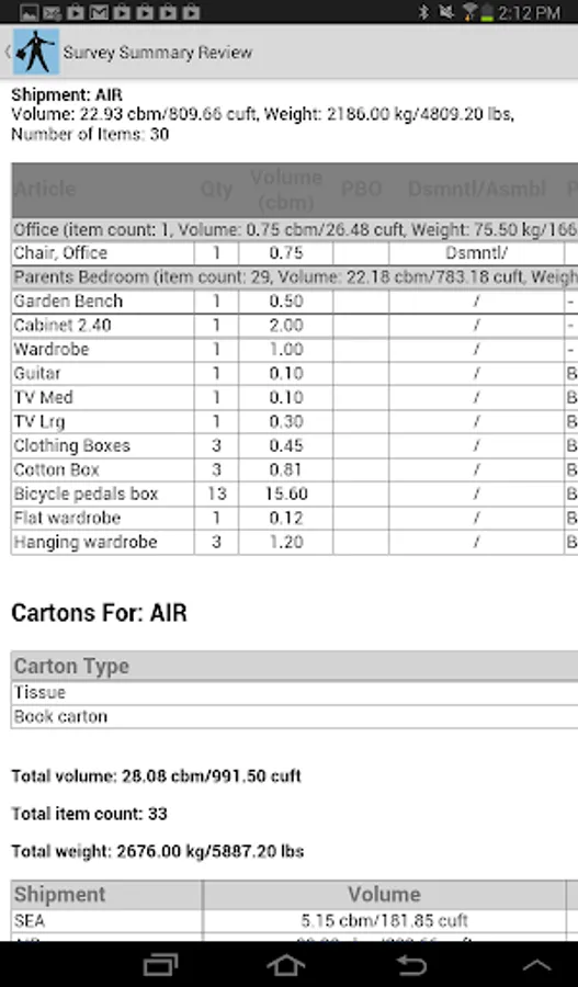The application allows for entering articles one-by-one or by checking off standard room articles. All residence access details as well as pre-move questionnaire (i.e. allowance, competition, required insurance type, storage for origin/destination, FIDI check list) can be easily captured. Survey requests can be created straight on the device, received by email if sent in Voxme xml format or downloaded from Voxme server. Survey summaries are created in text, html or PDF formats and can be edited and emailed to the customer right away. In addition, survey details are available in Voxme xml format for import into Voxme or any other move management system.