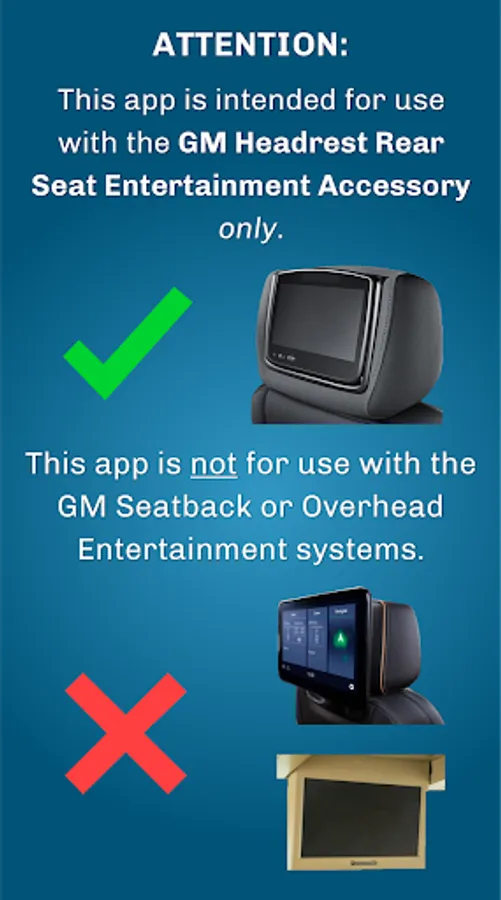 PLEASE NOTE: This app is intended for use with the GM Headrest Rear Seat Entertainment Accessory only and not for use with the GM Seatback or Overhead Entertainment systems.