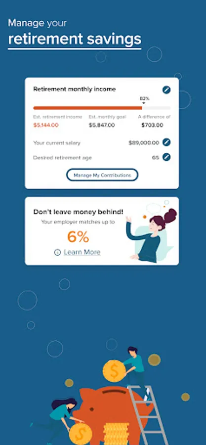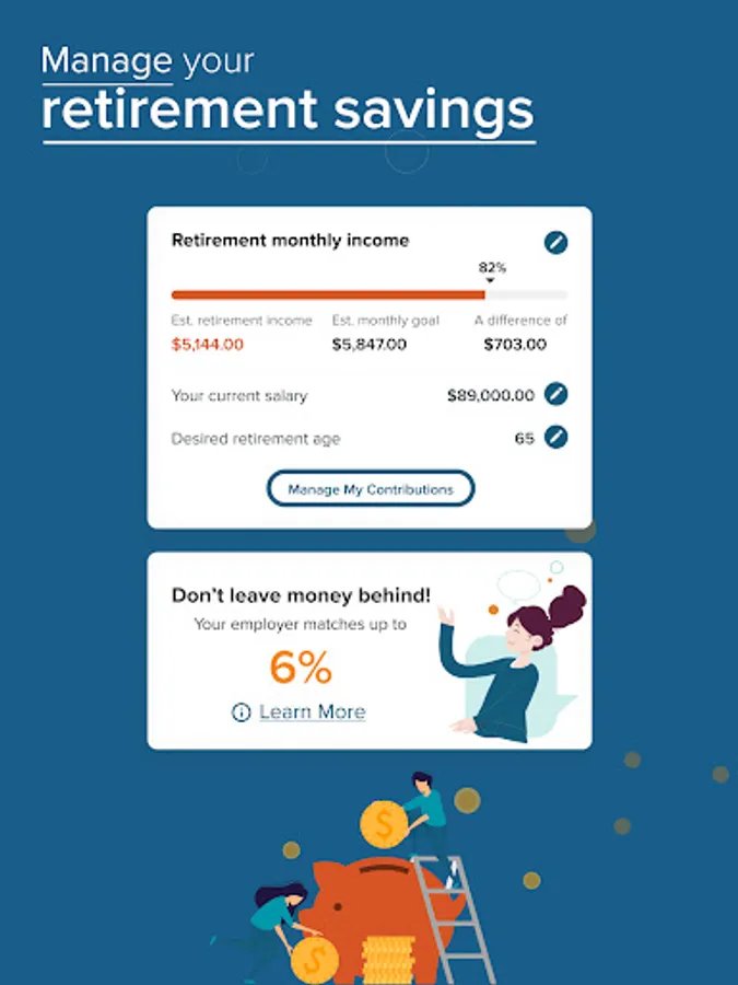 • Manage your health and retirement savings: Understand how much you've saved, what you'll need in the future and easily make changes to your savings and investments