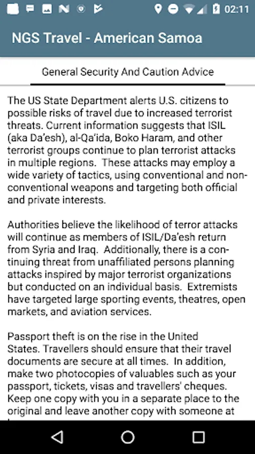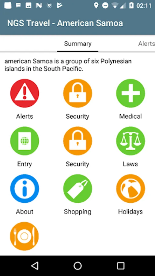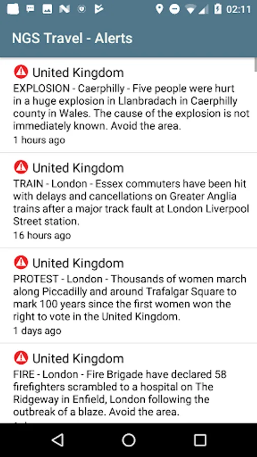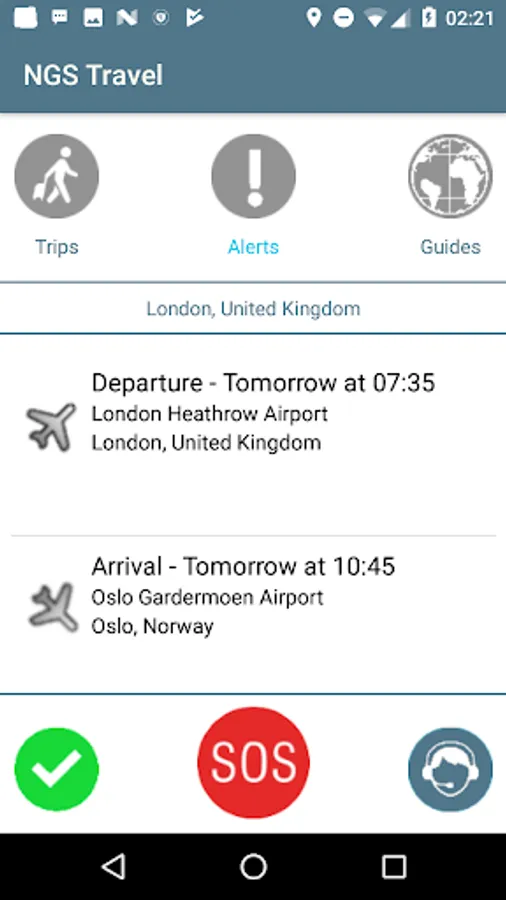 The NGS Voyage app downloads the latest alerts for your destination, giving you current security updates that might affect you. On the home screen you can easily see how many new alerts have come in since you last read them.