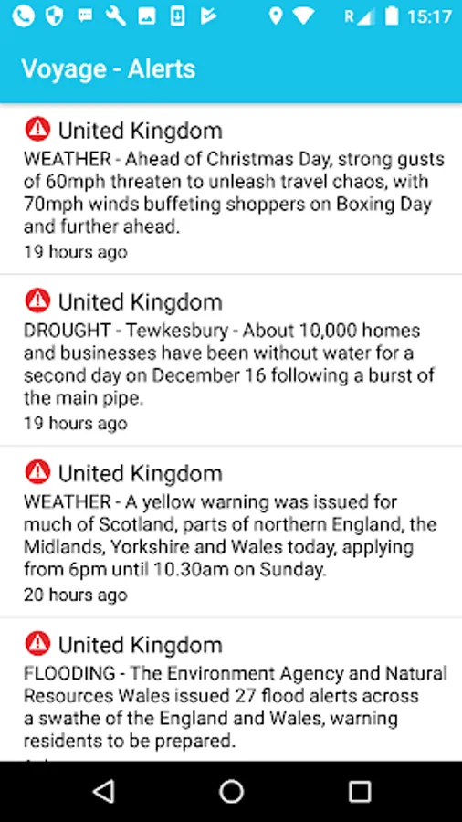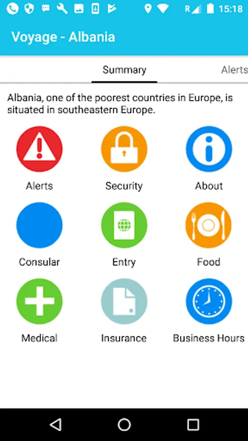 Voyage Travel downloads the latest alerts for your current location, giving you real time security updates that might affect you. The home screen shows you how many new alerts have come in since you last accessed them.