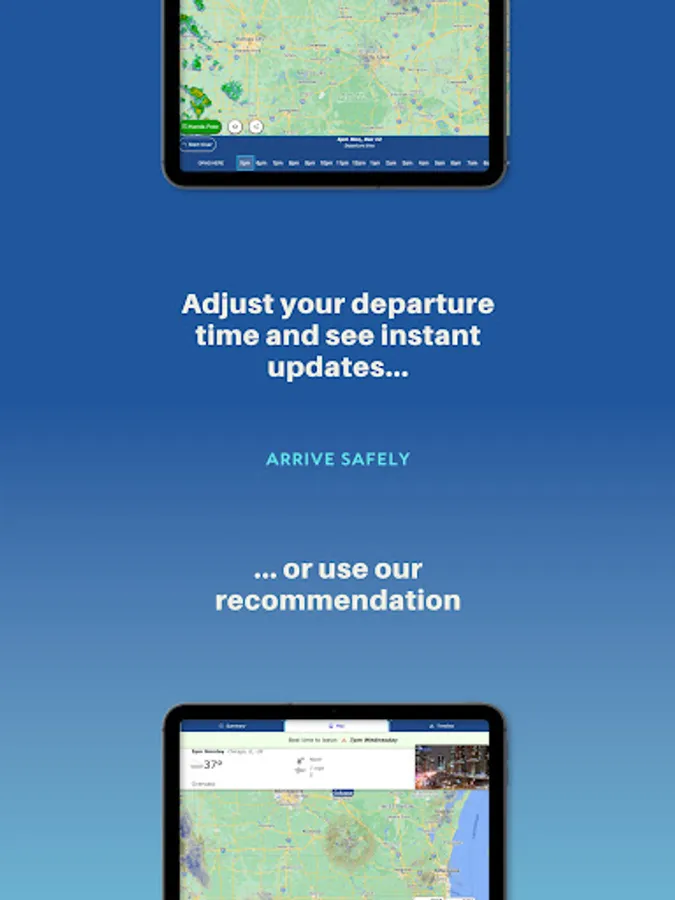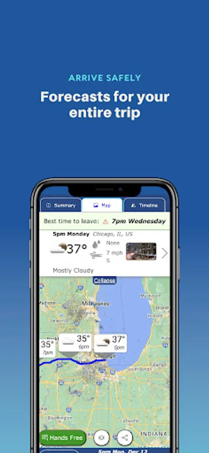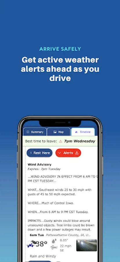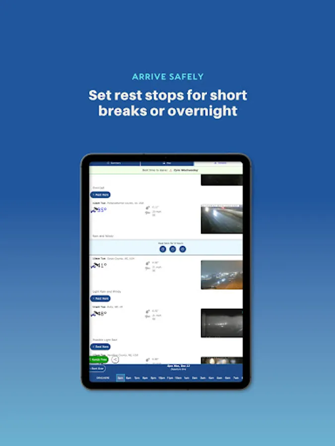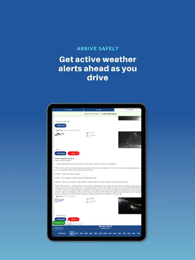 Travel weather forecasts for your entire road trip at the time you will arrive. Weather alerts, radar, traffic cameras, and plan for rests.