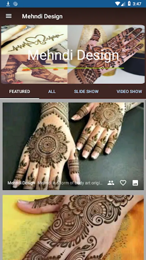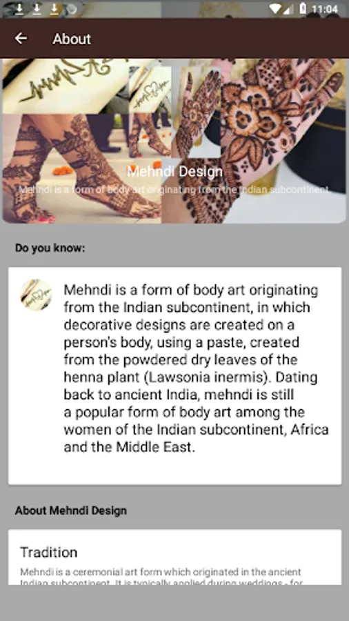 Mehndi Design is a form of body art from Ancient India, in which decorative designs are created on a person's body, using a paste, created from the powdered dry leaves of the henna plant.