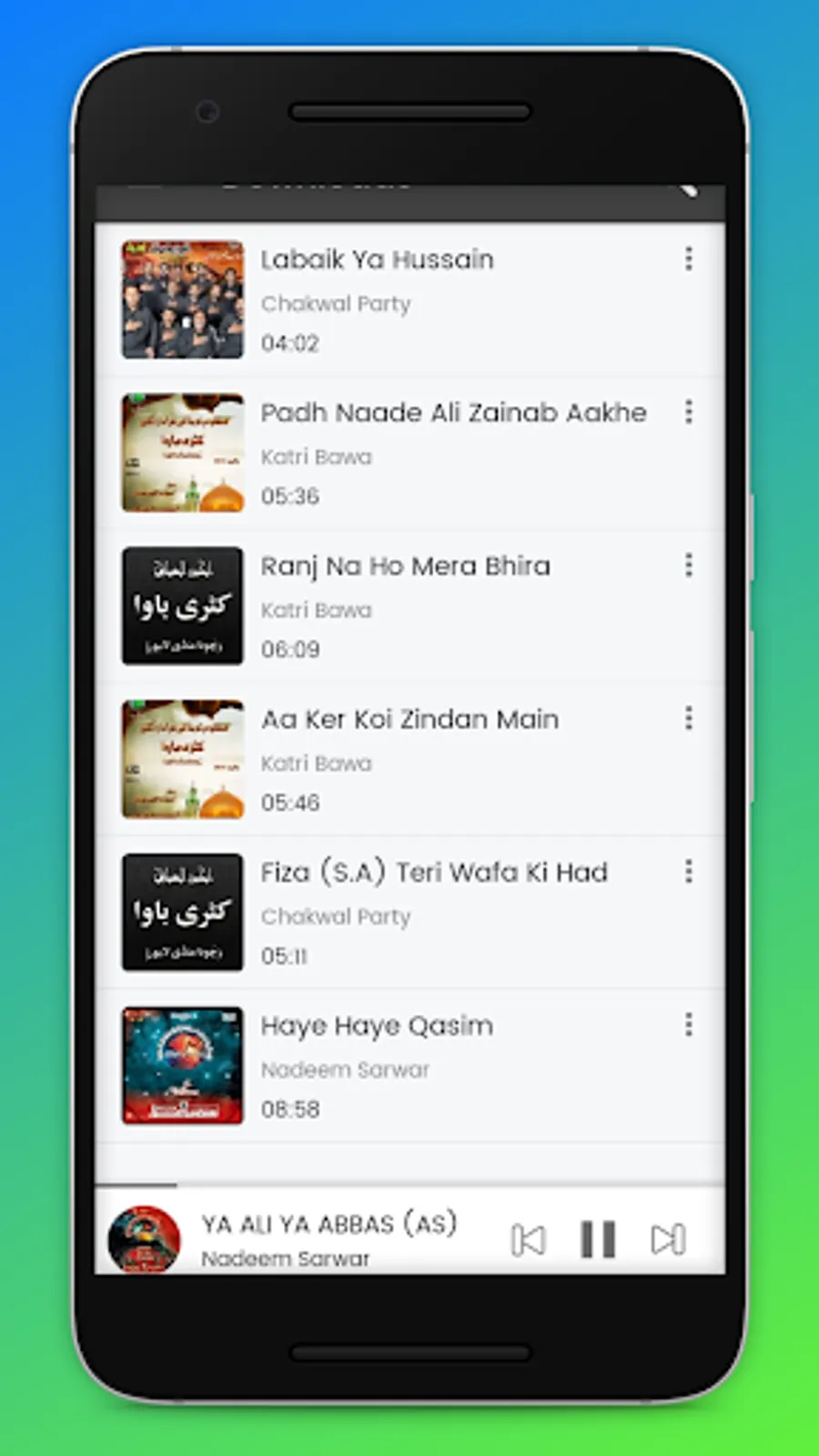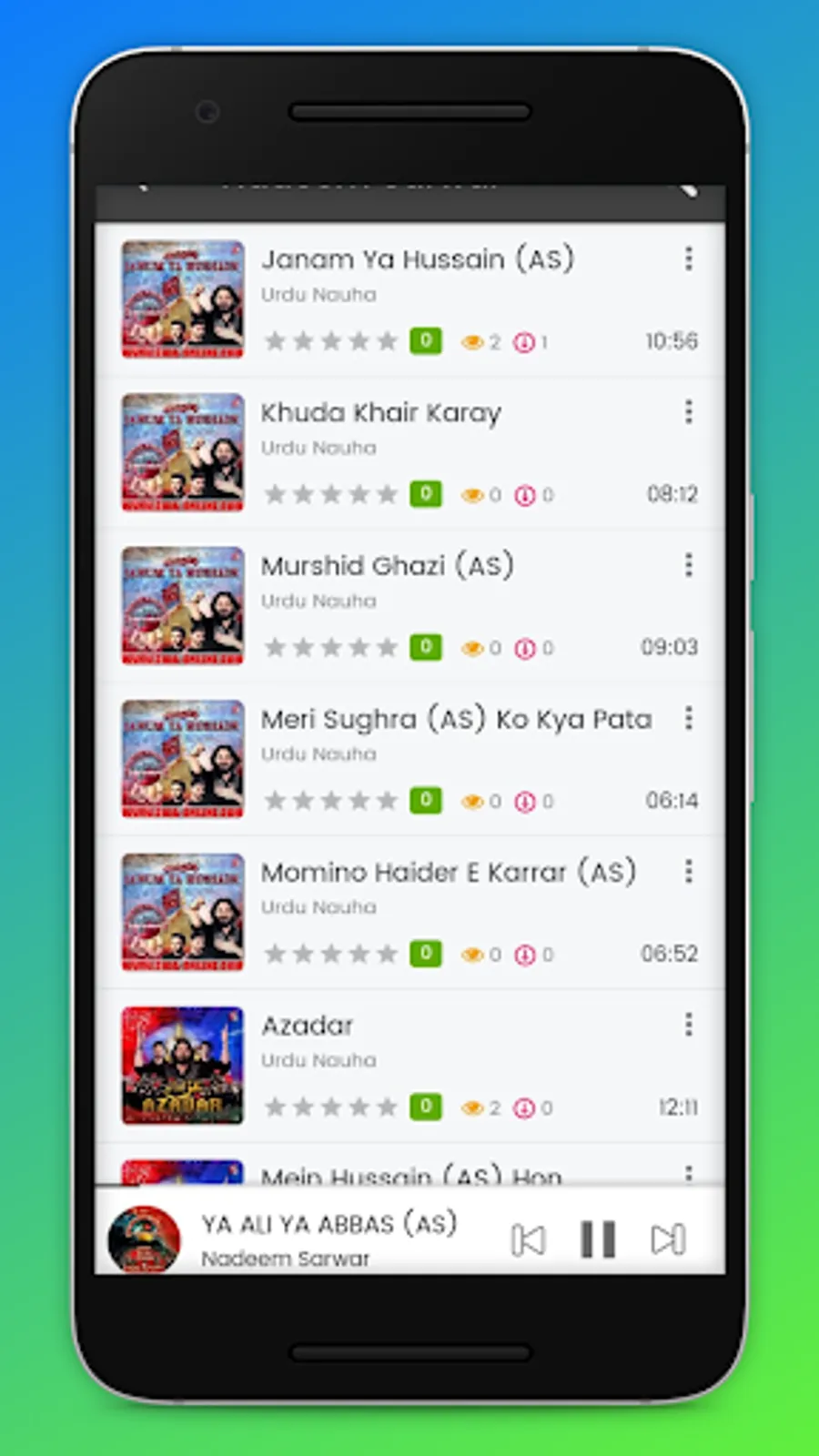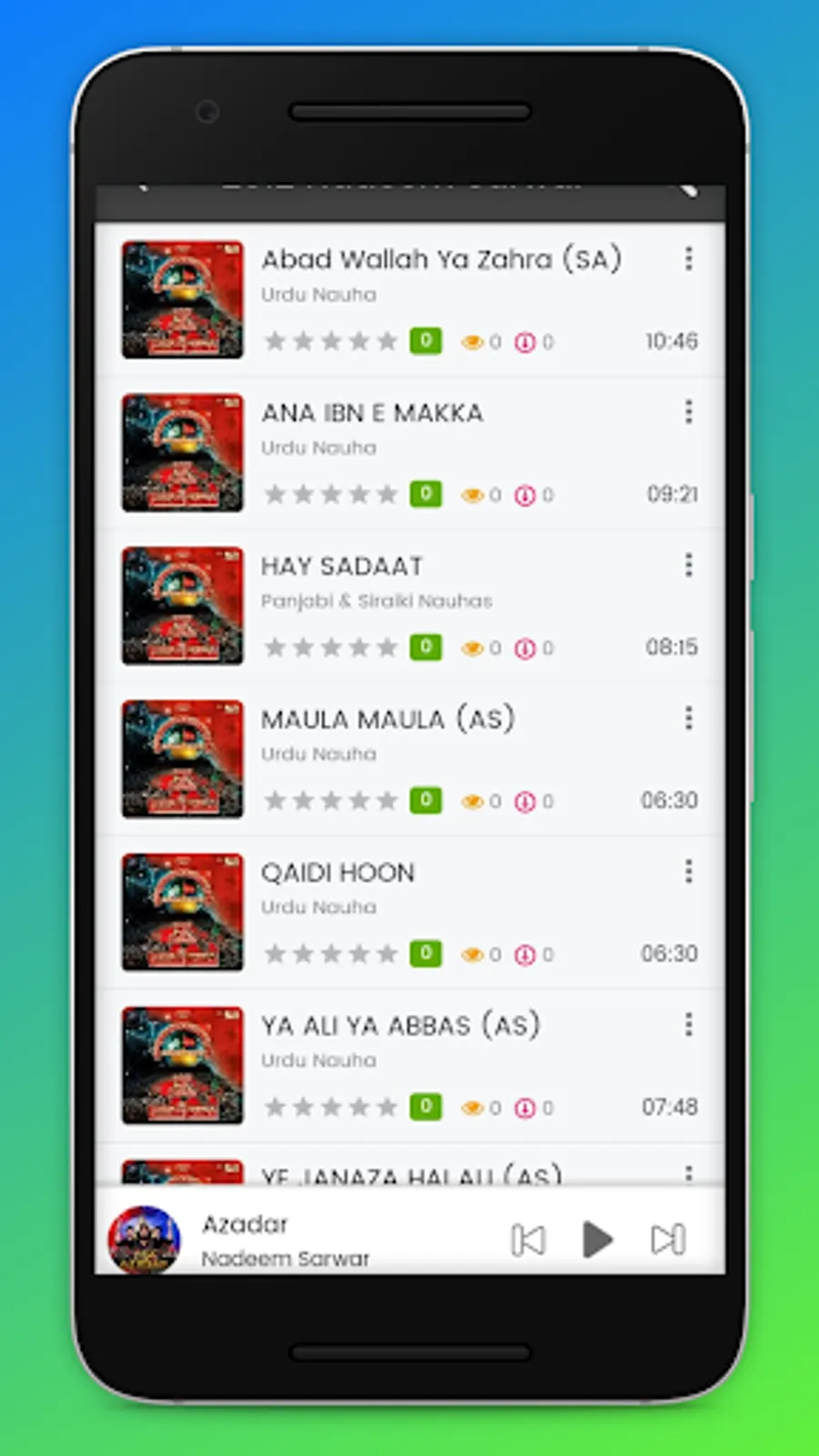 Azadaari Kashmir is an online mp3 streaming app which contains, Nauhas, marsiyas , manqabats , ziyaarat in various Languages Like : Kashmiri , Urdu, Punjabi, Persian, Arabic. The Azdaari Kashmir is developed specially for users of Kashmir as it contains kashmiri content of Marsiyas. This app contains Nauhas Of Famous Nauha Khans Like Nadeem Sarwar, Mir Hassan Mir, Syed Ali Safdar, Farhan Ali Waris, Meesum Abbass, Chakwal Party, Shahid Baltistani, Hassan Sadiq, Nasir Asghar Party, Irfan Haider, Ali Shanawar, Ali Jee, Hashmi Sisters, Ali Deep Rizvi, Katri Bawa and many more.