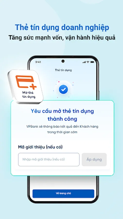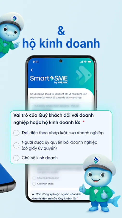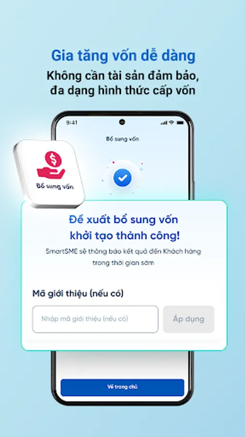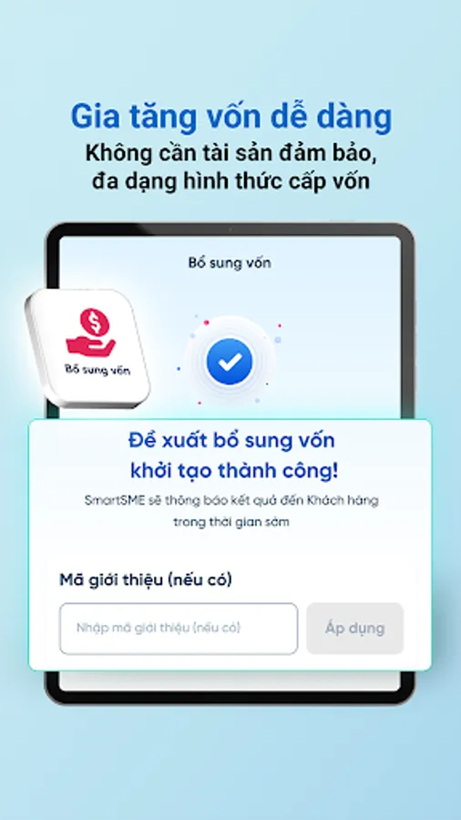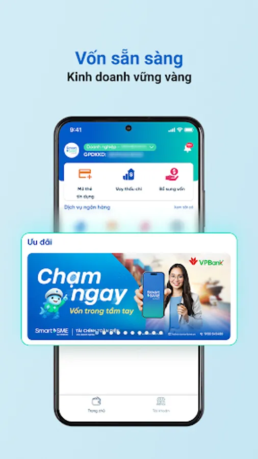 One-stop shop for financing product, designed specifically for SMEs, and business household. SmartSME by VPBank (SmartSME) is a safe, transparent, and convenient financial application that helps users easily access capital, optimize cash flow, and grow their business sustainably.