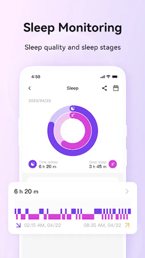 With the support of smartwatches, accurately monitor different stages of sleep (awake, light, deep, REM) and provide scientific suggestions to help improve sleep quality.