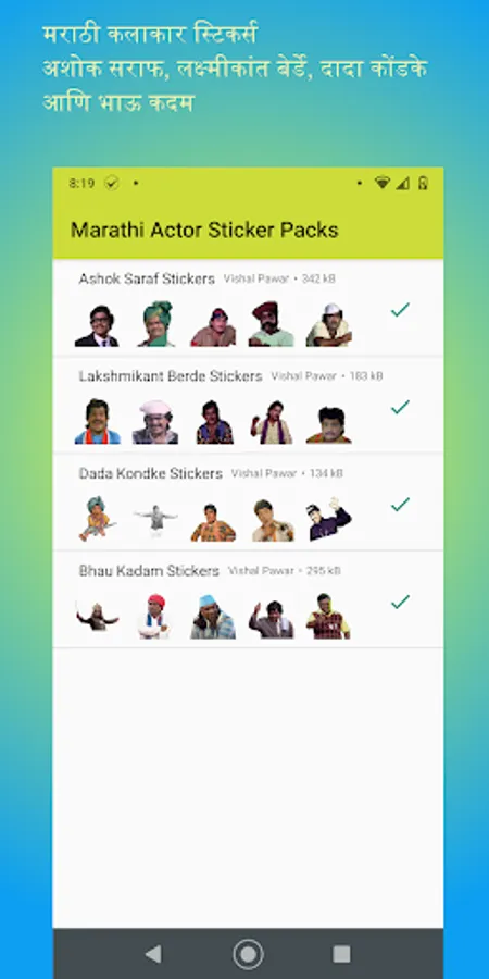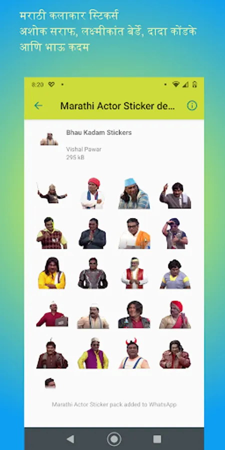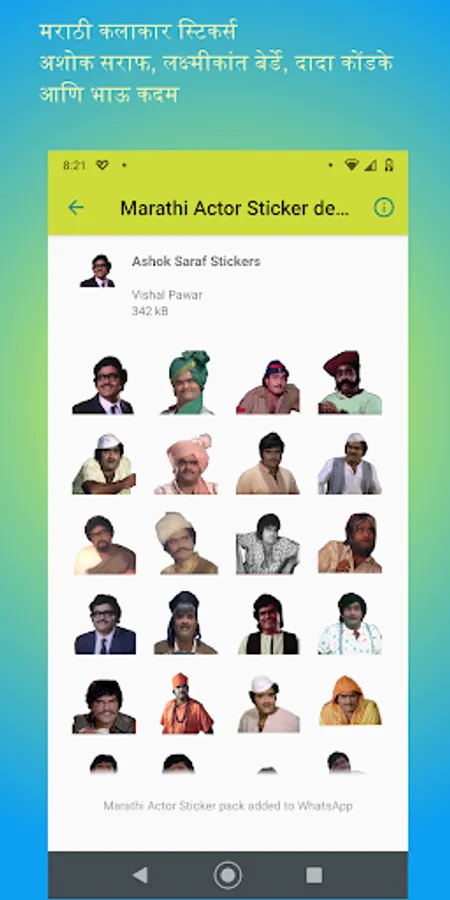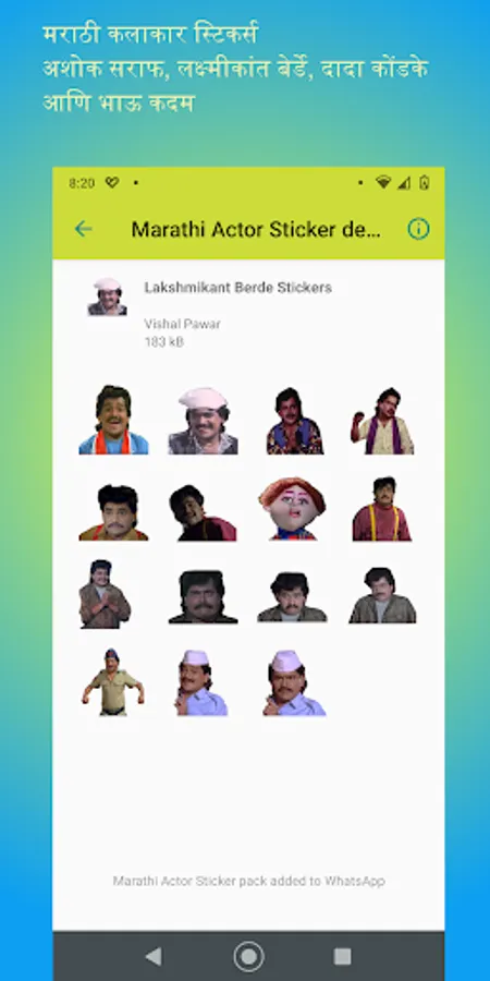 आपले आवडते अशोक सराफ, लक्ष्मीकांत बेर्डे, डेटा कोंडके आणि भाऊ कदम या अॅपचा वापर करून मित्रांना व्हॉट्सअप स्टिकर्स पाठवा.