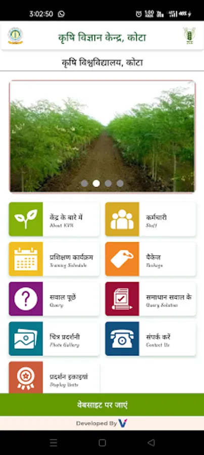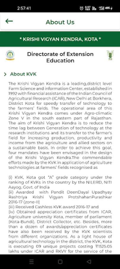 The Krishi Vigyan Kendra is a leading,district level Farm Science and information Center, established in 1992 with financial assistance of the Indian Council of Agricultural Research (ICAR), New Delhi at Borkhera, District Kota for speedy transfer of technology to the farmers’ fields. The operational area of this Krishi Vigyan Kendra comes under Agro-climatic Zone V in the south eastern part of Rajasthan. The aim of Krishi Vigyan Kendra is to reduce the time lag between Generation of technology at the research institutions and its transfer to the farmer's field for increasing production, productivity and income from the agriculture and allied sectors on a sustainable basis. In order to achieve this goal, four mandates have been envisaged in the design of the Krishi Vigyan Kendra.The commendable efforts made by the KVK in application of agriculture technologies at farmers’ fields recognised as (i) KVK, Kota got “A” grade category under the ranking of KVKs in the country by the NILERD, NITI Aayog, Govt. of India (ii) Awarded with Pandit DeenDayal Upadhyay Rashtriya Krishi Vigyan ProtshahanPurashkar 2016-17 (zone-II) (iii) Received Cashless KVK award 2016-17 and (iv) Obtained appreciation certificates from ICAR, Agriculture university Kota, member of parliament (Kota-Bundi), District Collector, etc. Besides, more than a dozen of awards/appreciation certificates have also been received by the KVK scientists from different organizations. As a light house of agricultural technology in the district, the KVK, Kota is executing 09 unique projects costing ₹1525.05 lakhs under ICAR and RKVY for the service of the farming community, out of which ₹ 443.75 lakh has been used for infrastructural development . The name of the running projects are as (i) Dairy farming and management (ii) Food processing & value addition (iii) National innovations in climate resilient agriculture (NICRA) (iv) Pulse seed hub (v) Strengthening of infrastructural facilities at KVK (vi) Agriculture technology & management quality improvement centre (ATMQIC) (vii) Standardization of agro-techniques and quality assessment of drumstick (viii) Goat farming and (ix) Oilseed seed hub. KVK has developed 18 model demonstration units of which important ones are dairy, food processing & value addition, quality seed production, vermi-compost, nursery, mother orchard, crop technology park, bio- pesticide, beekeeping, plant health clinic, mushroom production, mineral mixture and azolla for imparting skill-oriented trainings to rural youth for development of their entrepreneurship. These units provide an exemplary learning experiences to the visiting farmers and also help in horizontal expansion of these technologies among the farming community in the district.