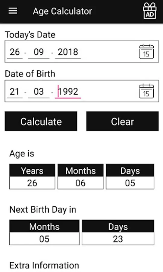 Age Calculator is one more best Feature of Citizen Calculator App Where you can calculate your Age in Year, Month, Weeks, days, Hours, Minutes and Second. Also you can show your Next Birthday by Days for many years.