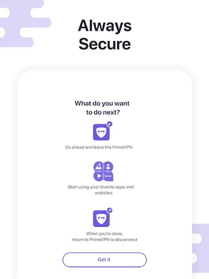 • Location Spoofing: PrimeVPN protects your IP address and masks your location from data collectors.