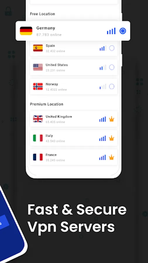Through a Global Proxy Master Network , that includes America, Europe, and Asia, we plan to expand secure servers to more countries shortly. Many Secure VPN-Global Proxy Servers are free, and you can switch between servers at any time by tapping on the flag to change location.