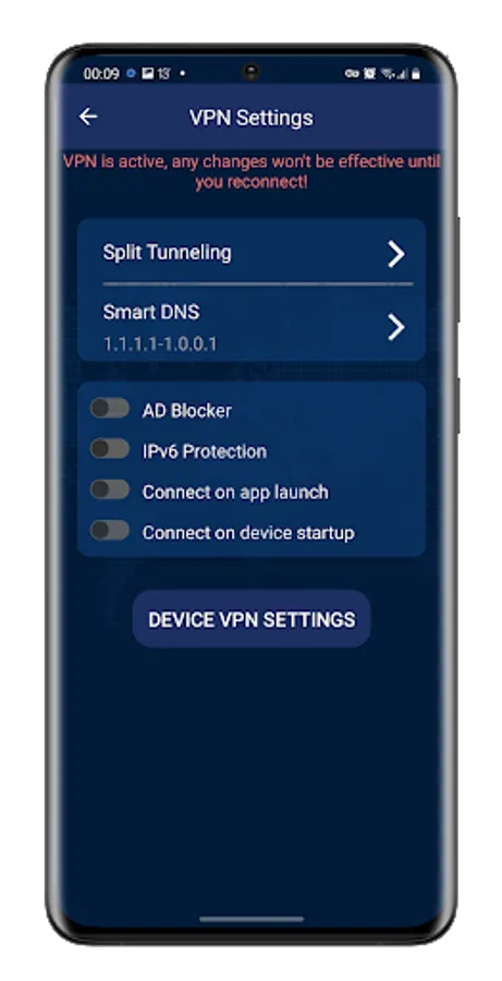 Other features include an AD Blocker, IPV6 Disable or Enable, A Logs View function, DNS Option & Smart DNS.
