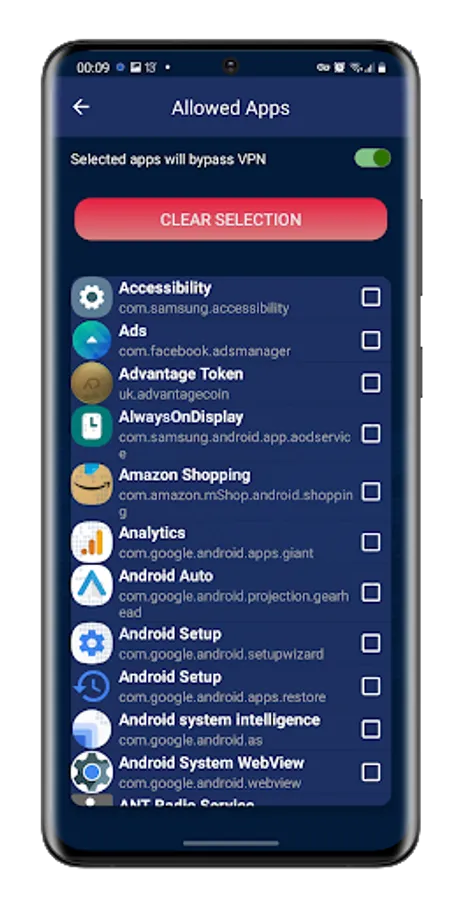 Our app also contains a built in kill switch so if your connection does get cut off, it will stop your data until you are reconnected to the VPN service again. Also included is a VPN Bypass. Select the apps you wish to run through your normal connection whenever you like.