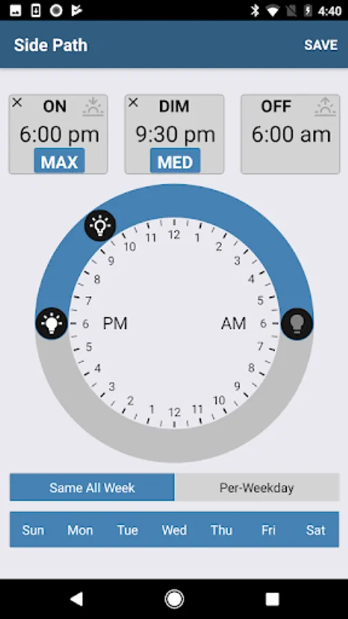 • Set specific times or sunset to sunrise with offset.