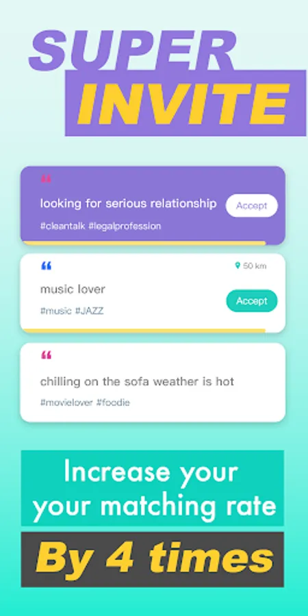 5 Super Invites π daily increases your chance of being accepted. Adding a maximum of 5 conversations allows you to chat with more new friends at the same time. Accept missed invitations instantly, and remove ads that disturb you when you are chatting happily. Put on a fancy look π₯ to enhance attractiveness.