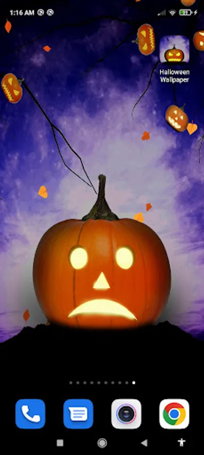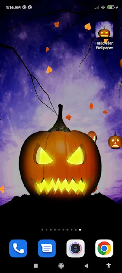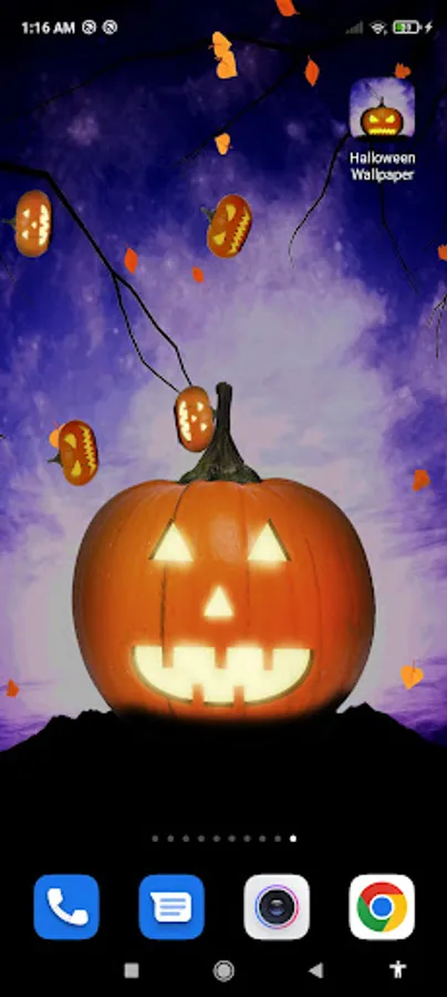 Halloween Live Wallpaper will let you customize basically everything. Change number, speed, rotation and color of falling pumpkins, number, speed and rotation of leafs. It is interactive and will respond on touch. When the present is touched, the pumpkin will change itself coorespondently to the one touched.