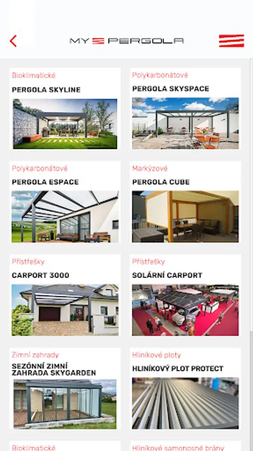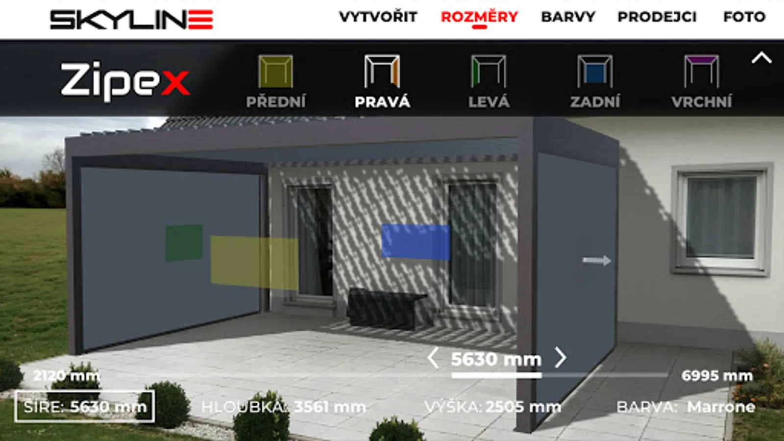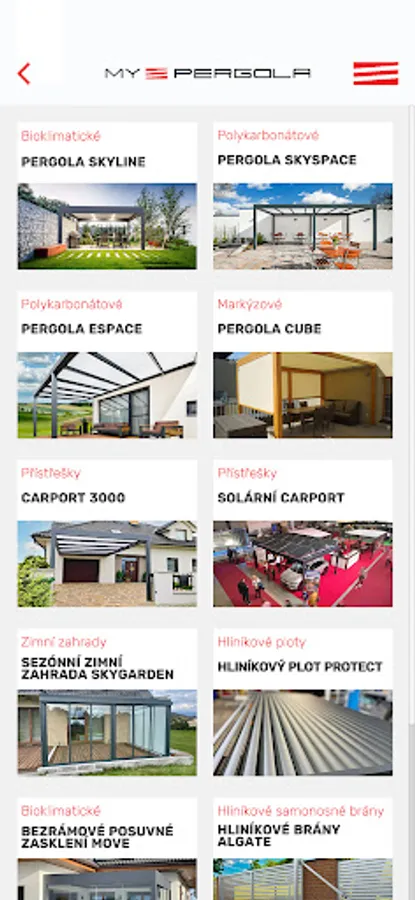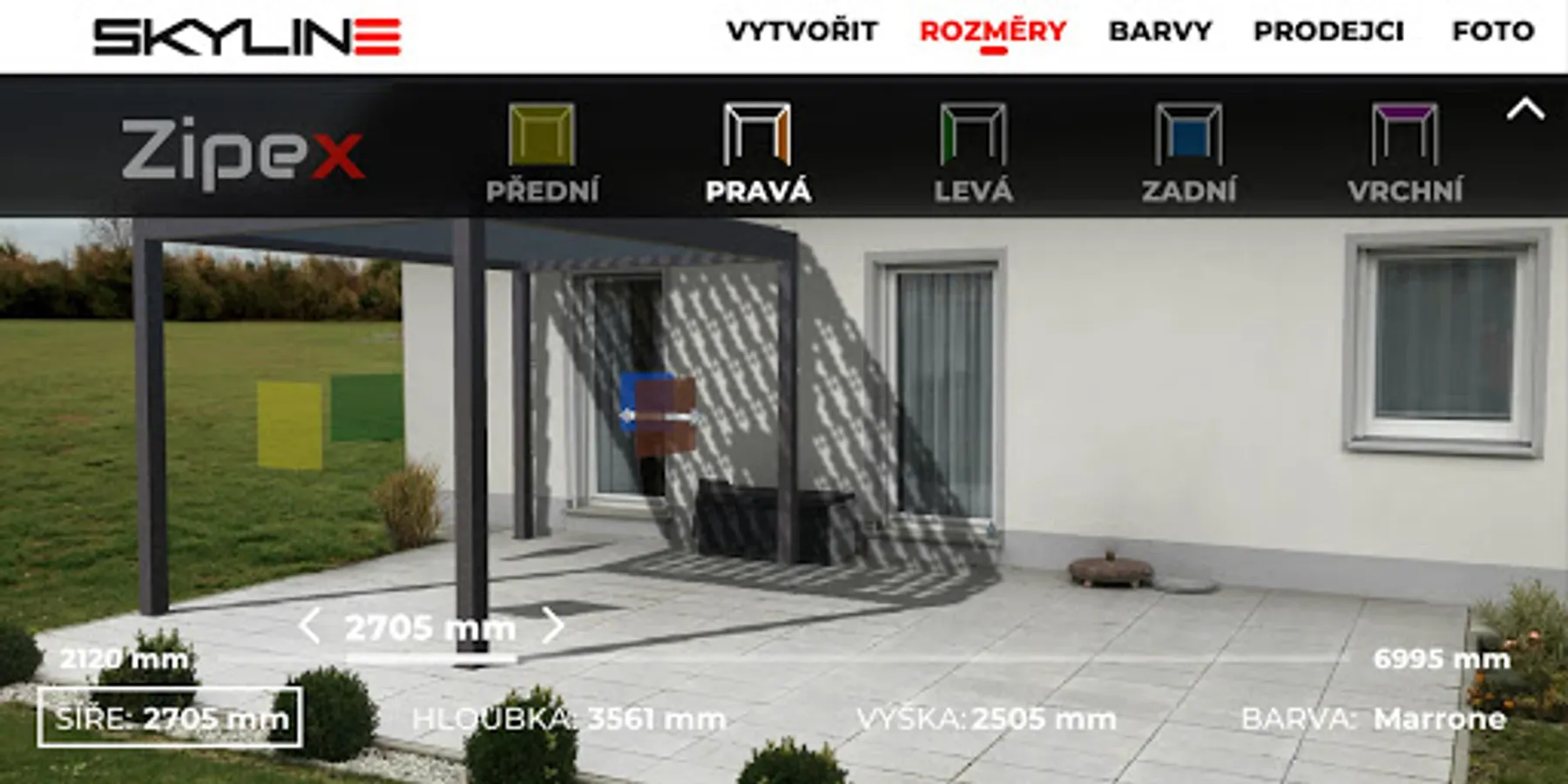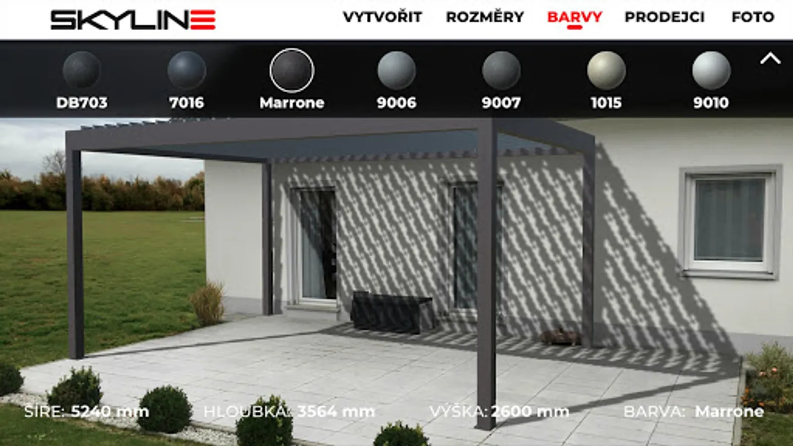 In the MyPergola application, explore the range of AL Pergoly s. r. o. Thanks to augmented reality, try the SKYLINE and SKYSPACE pergolas in any space.
