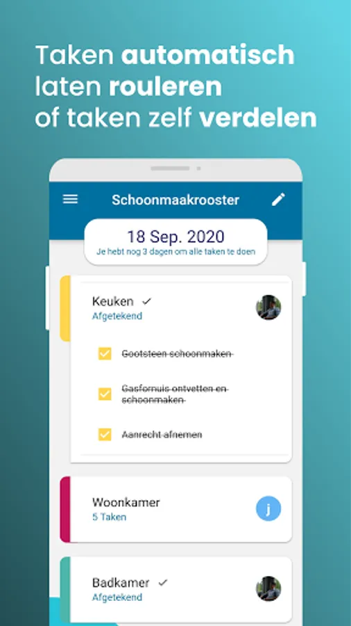 It's easy. You create a group, you invite your friends / roommates, you create tasks and the app will automatically divide and rotate the tasks for you every week / day / month / year.