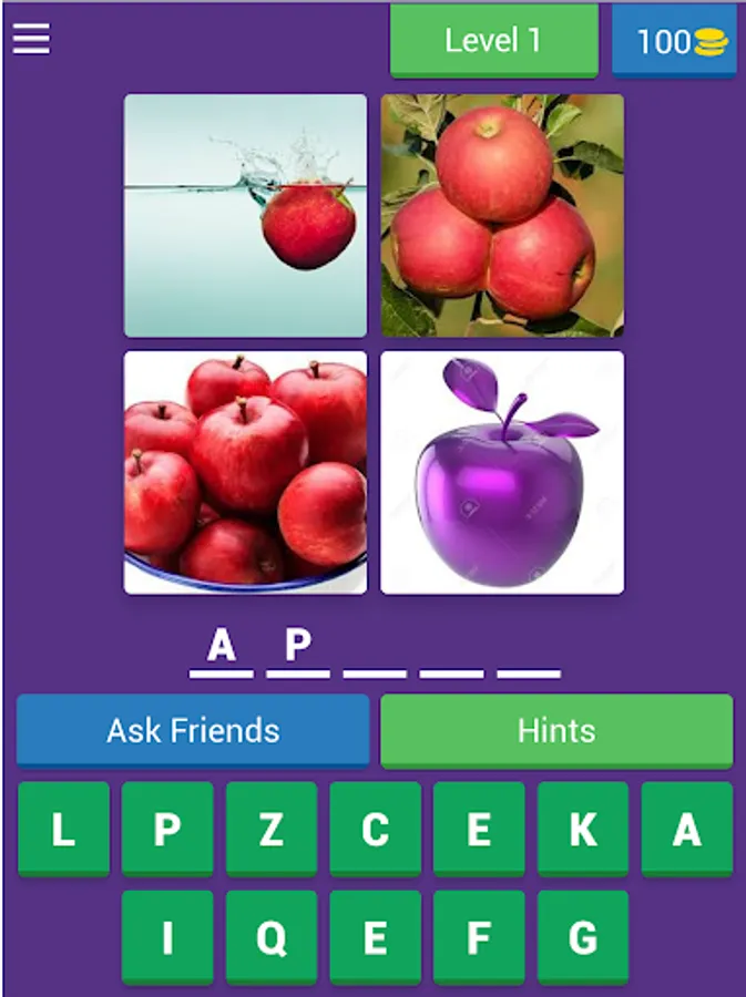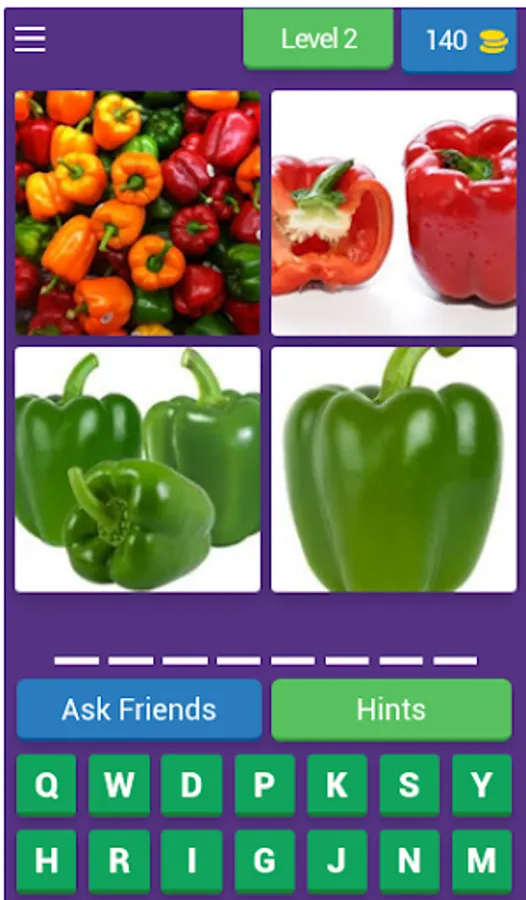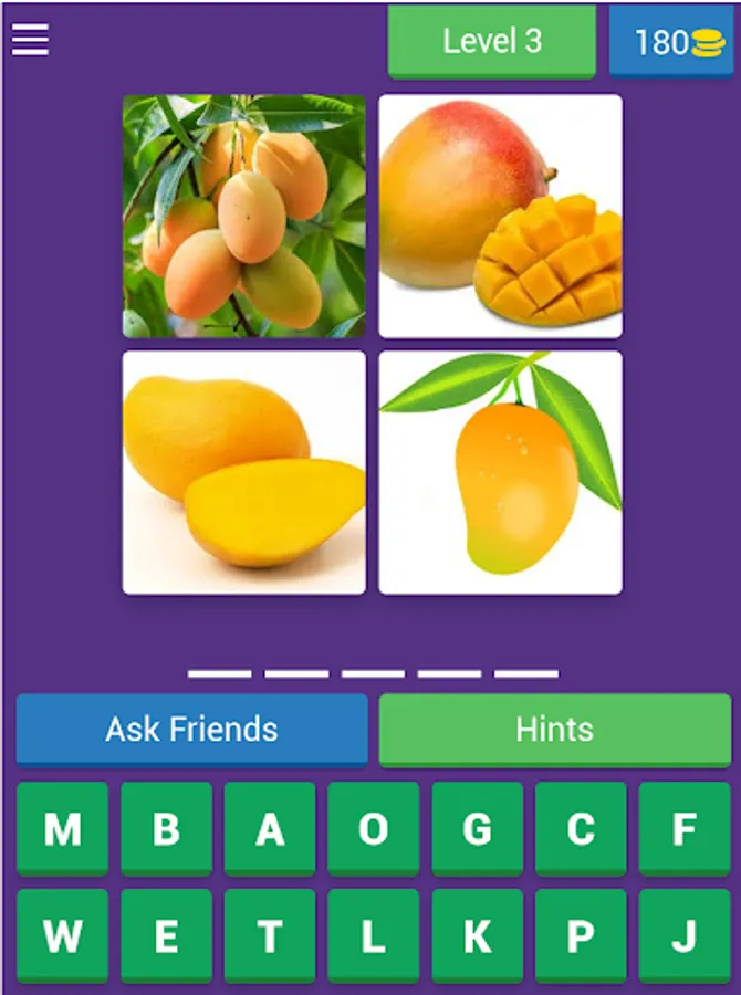 A game for learning names of fruits and vegetables with spelling. We are giving 4 images and few alphabets using this you have to find the name of fruit OR vegetables .