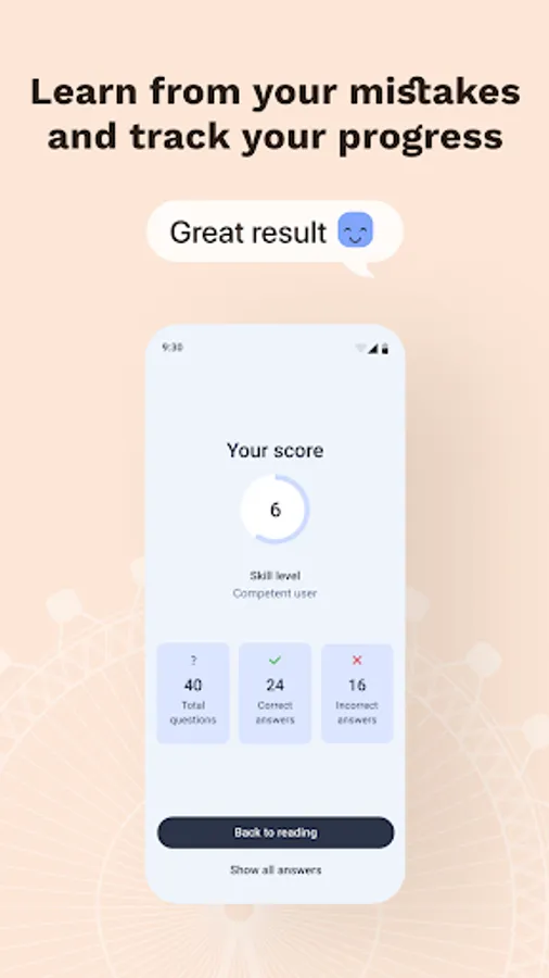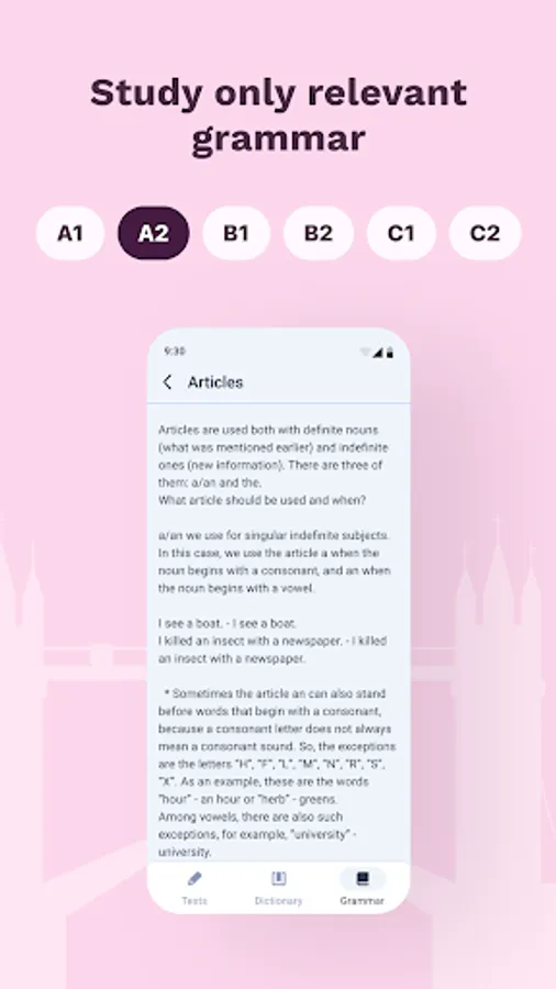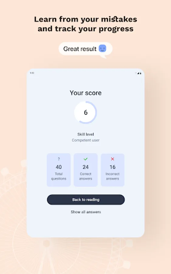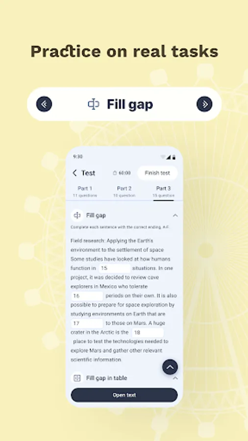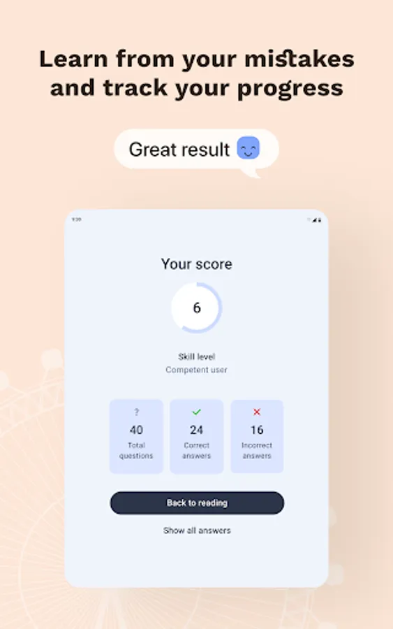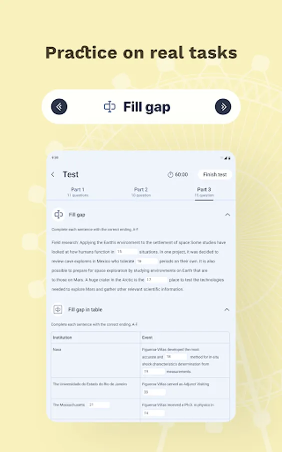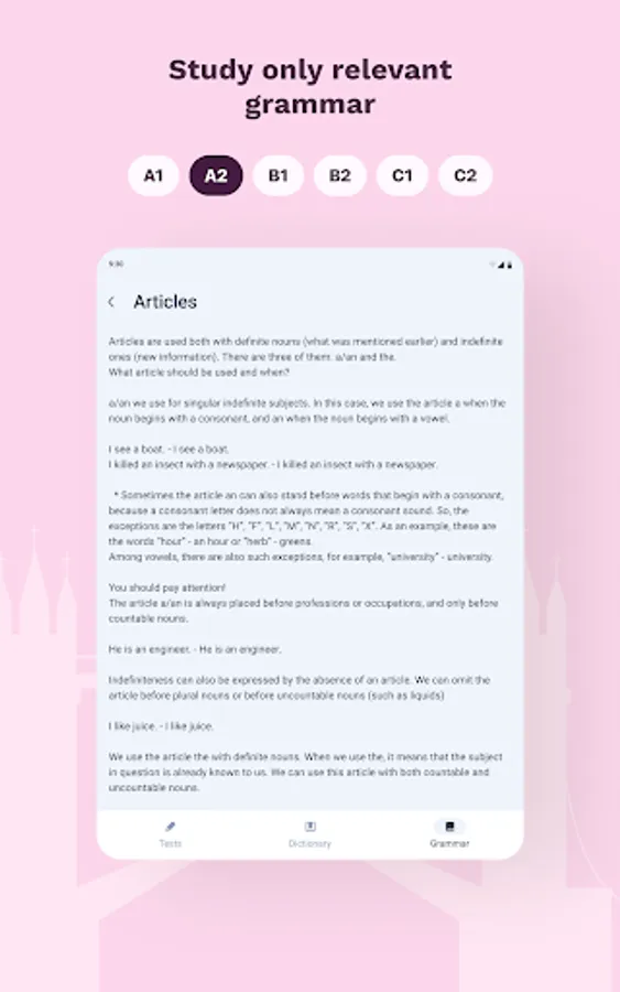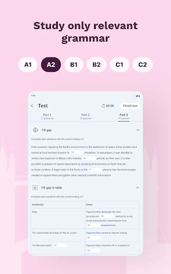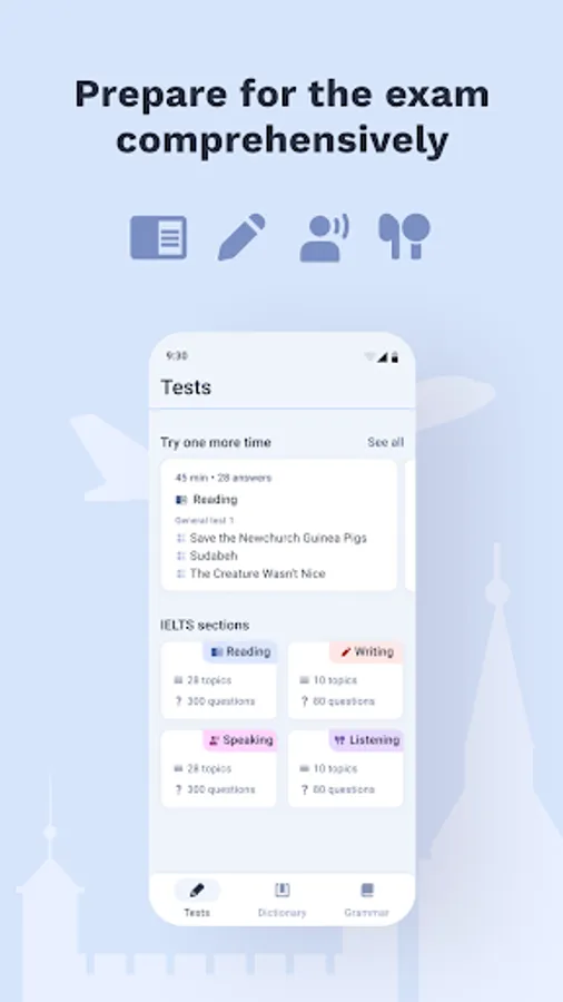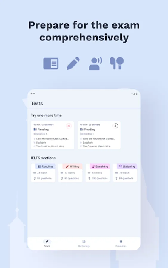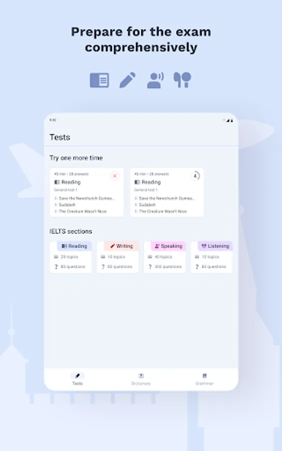 To make learning even more well-rounded, we've added grammar topics to the app, so you can look back at them in case you want to refresh your memory. The tests and grammar topics are like pieces of a puzzle. Working through them will give you the complete picture of what you need to know to do well on the IELTS Certification.