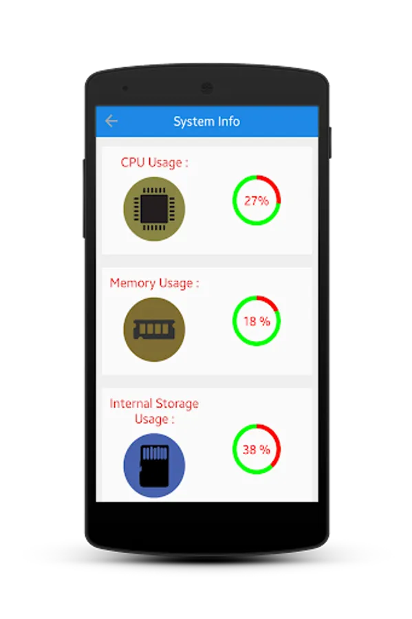 System Info Manager: Provides the current System Information: CPU usage, Memory usage, Internal and External Storage.