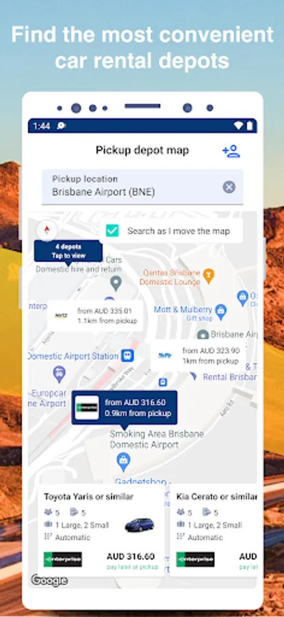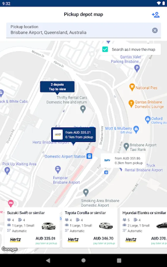 Our advanced booking engine features “geolocation search” which allows you to find the closest car rental depot. You can either turn on your device’s GPS or enter a specific location (e.g. street, airport or landmark) to get a list of vehicles with the most convenient depot. After that, you can compare, select and book a car hire in an instant!