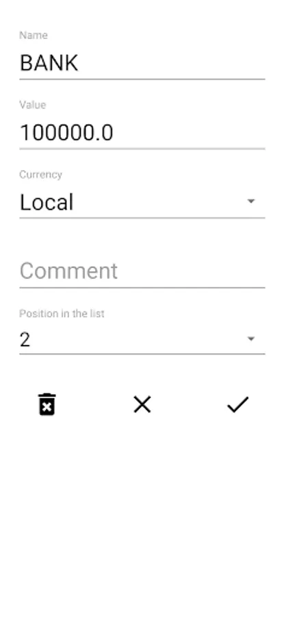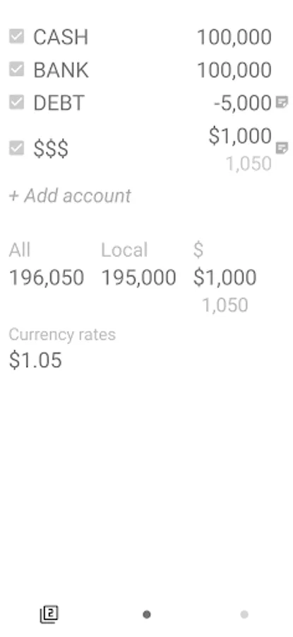 Add accounts. The wallet automatically sums up all the money. You can add accounts in different currencies. With this wallet, you always control where your money is.
