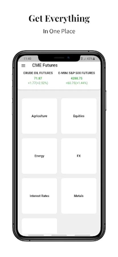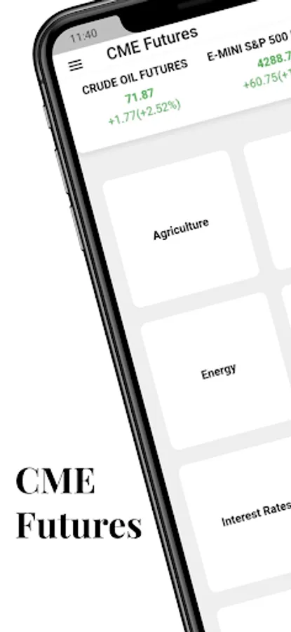 CME Futures provides you all the data you need to trade and help you gauge the broder market by showing agriculture prices, equities prices, energy prices, forex(FX) prices, interest rate data, metals prices and even micro futures prices.